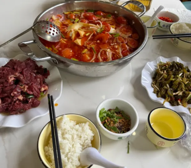 想在家复刻一道当地味,可以试酸笋牛肉。牛肉逆纹切薄片,先用蒜末、生抽、少量木薯粉抓匀;热锅下油,先爆香姜蒜和酸笋,再下牛肉大火快炒,十几秒就收。不是把料堆满,而是要留一点酸香和肉汁的空隙。