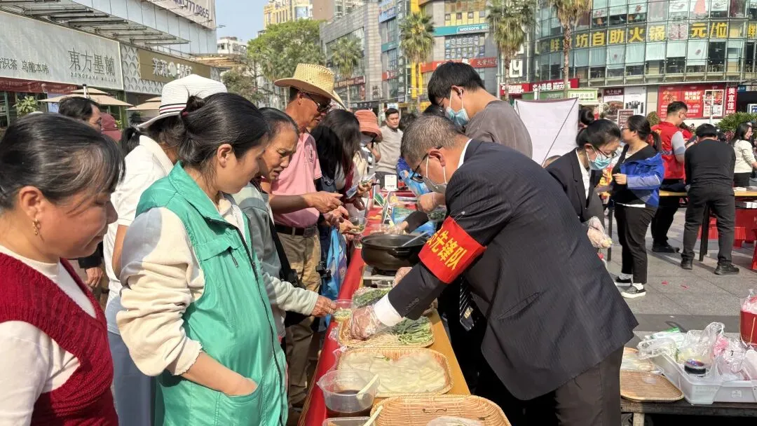 活动现场布置井然有序,便民服务区域人头攒动,内容丰富、形式多样,设有民族非遗美食体验、健康义诊、免费家电维修、政策咨询等多个服务点位。其中,在民族非遗美食体验区,南宁饭店党员、青年志愿们化身“非遗传承人”,现场展示广西传统打油茶、春卷的制作技艺,并邀请居民参与制作。醇厚飘香的油茶,清爽鲜美的春卷,吸引众多居民排队体验、品尝,大家在欢声笑语中共享美食,在互动体验中传承民族美食文化。