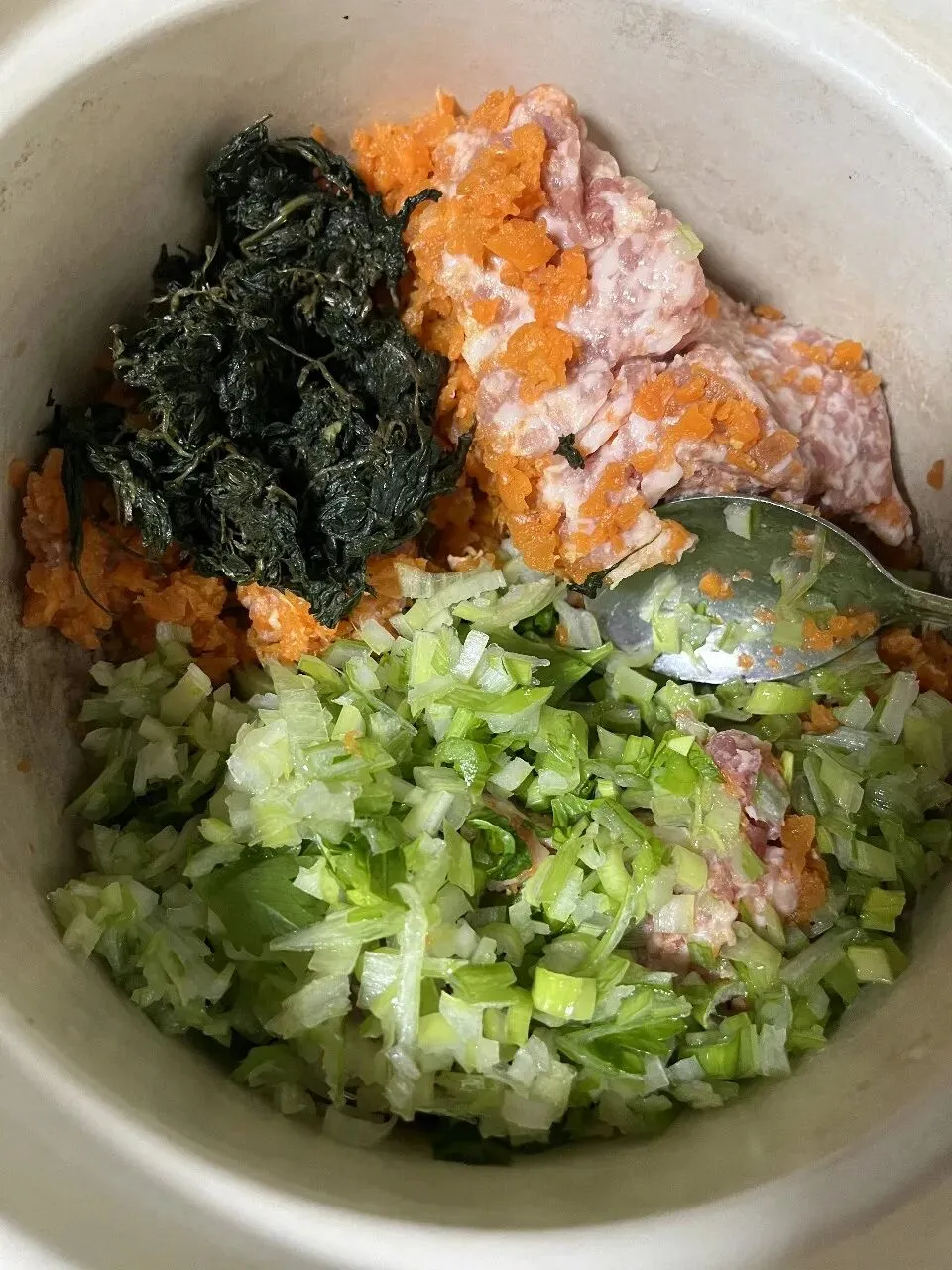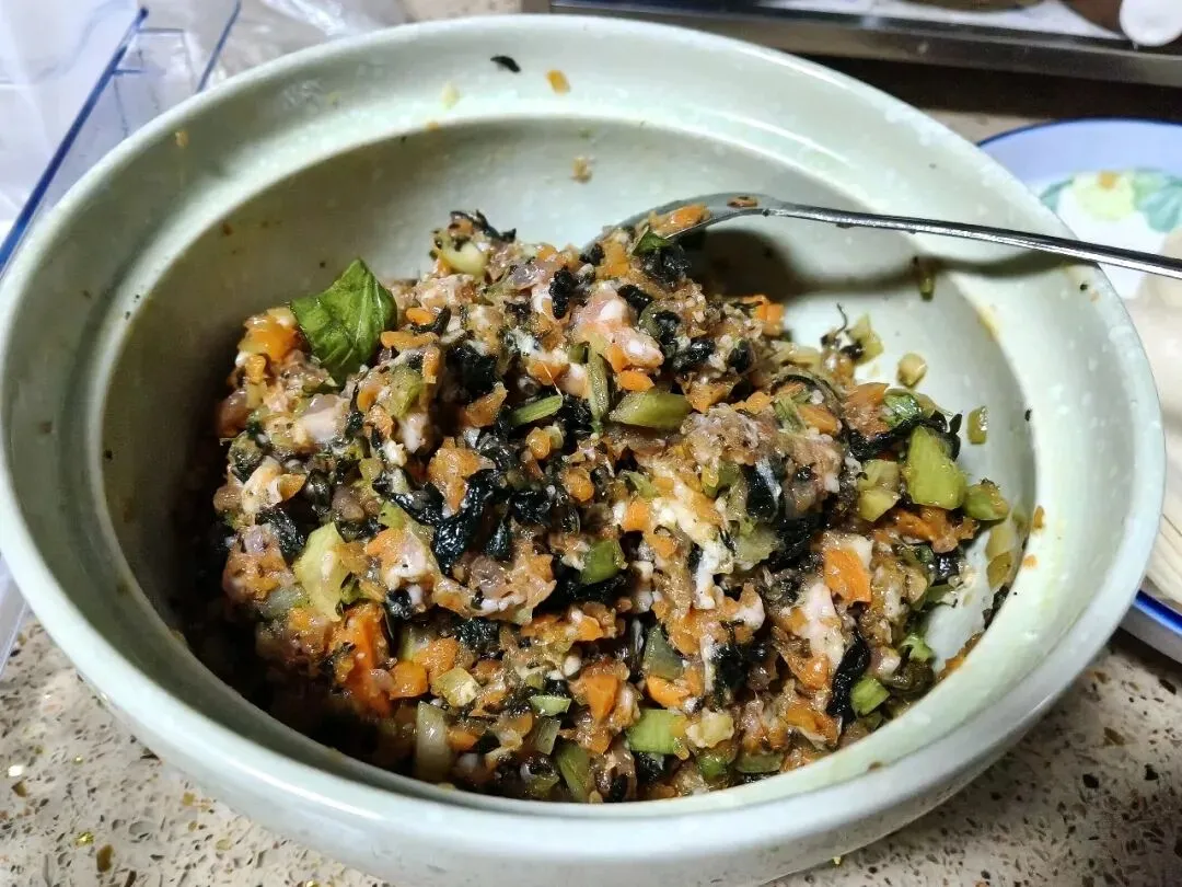 谢过阿樱,我赶紧回家把大葱冲洗了一下,切成细细的葱花,撒进肉末和胡萝卜丁里。接着,我拿出婆婆给的金盖,挤干水分,撒进馅料中。一瞬间,九层塔独特的清香就弥漫开来,混着肉香、胡萝卜的清甜和大葱的鲜气,整个厨房都变得香喷喷的,光是闻着味道,就已经让人食欲大开。