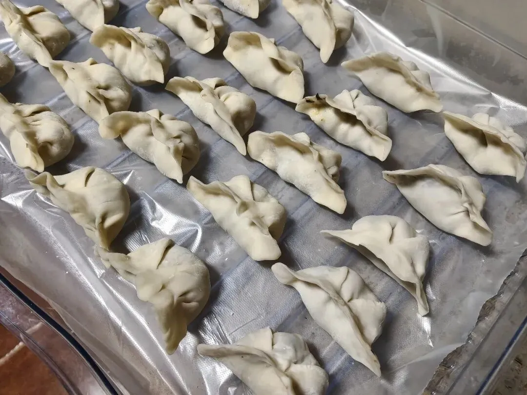不多时,一个个饱满的饺子就整齐地摆在铺了保鲜膜的托盘上,像一个个小小的元宝,可爱又温馨。