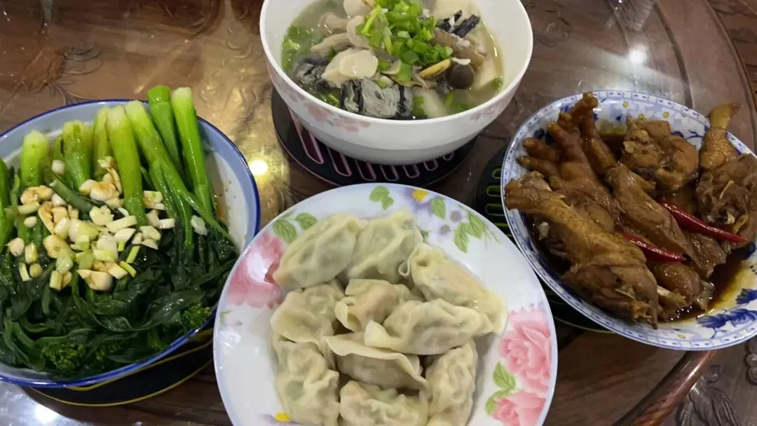 细雨还在窗外飘着,屋里热气腾腾。一口饺子下肚,九层塔(荆芥)的清香在舌尖散开,暖的是胃,更是心。这平凡的清晨,有婆婆的惦念,有姐妹的贴心,日子简单,却处处是温柔。
