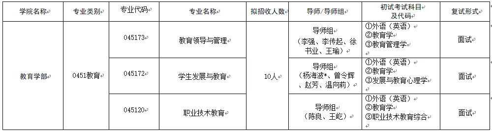 (1)复试形式:采用面试方式进行,重点考察考生的教育实践经验与实践能力、科研经历与科研能力、分析解决实际教育问题的能力、学术发展潜力及综合素质等。