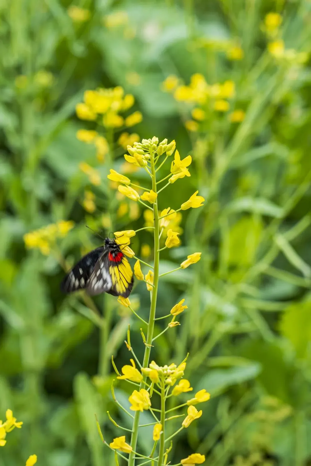 中间这片油菜花海最是惊艳!层层叠叠的金黄在阳光下轻轻摇曳,舒展成一片温柔的光浪。蜜蜂在花间穿梭,蝴蝶翩跹起舞。花香不浓,若有若无地飘散在空气里,和着青草与泥土的芬芳,是春天独有的气息。