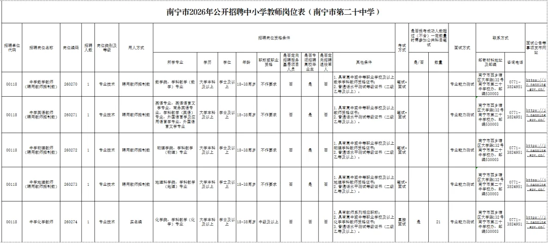 1.岗位条件、资格审查咨询:南宁市第二十中学办公室:0771-3824951。