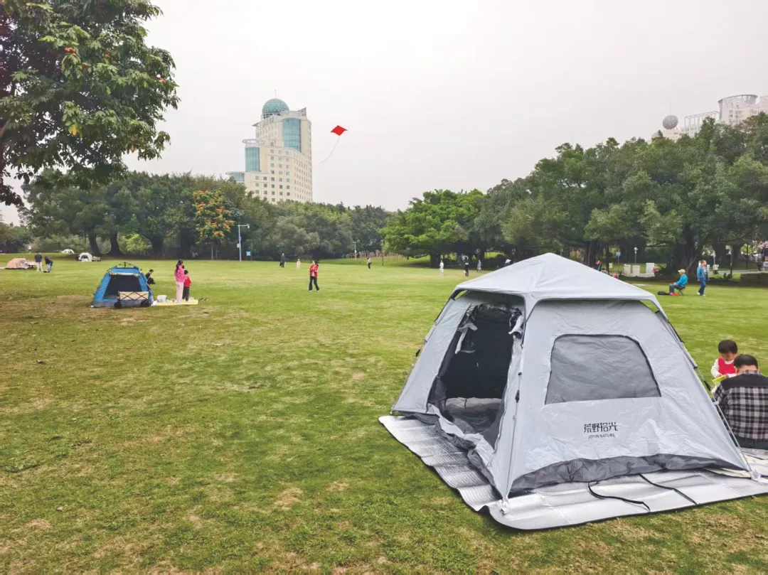 春风送暖,万物复苏,绿城南宁迎来户外休闲黄金季。帐篷、天幕、折叠桌椅、露营车等装备全面上新,线下商超与线上平台露营商品销量同步攀升。近日,在南宁多家大型超市及南湖公园等热门露营点位,春日露营热潮正点燃消费新活力,让“家门口的诗与远方”点亮市民休闲生活。不少家庭趁着周末来南湖公园露营。记者 宋延康 摄