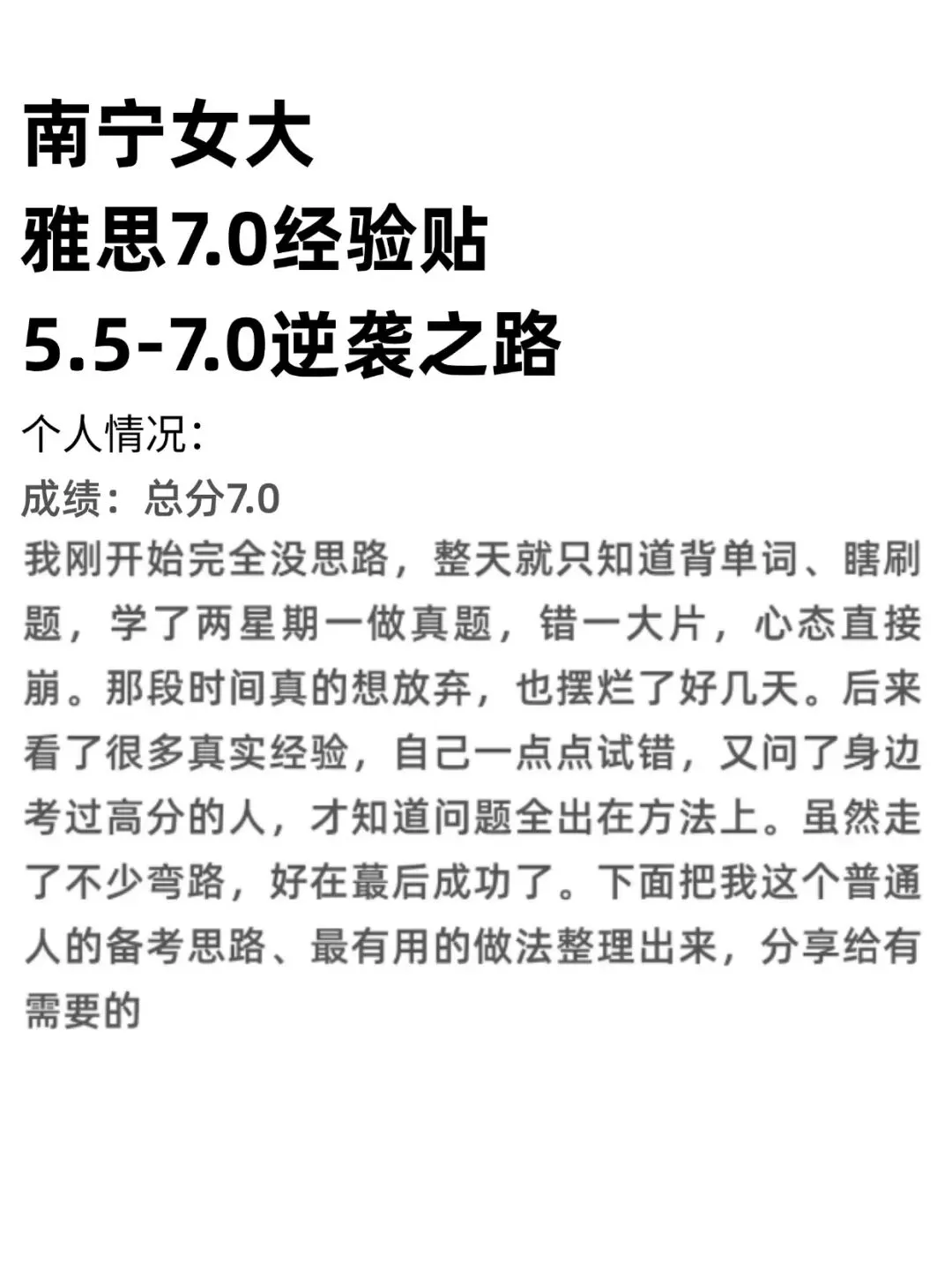 我不是天赋型选手,只是普通二本学生,从5.5到7.0,没有捷径,全靠那几个月的踏实坚持、及时调整方法、不放弃不摆烂。雅思难的不是题目,而是坚持和正确的努力方向,找对好的老师或是机构也很重要,能够快速且有效提高自身的学习。往往不好的老师与机构则是在浪费时间、成本与精力。不用因为基础差焦虑,不用因为暂时没进步自我怀疑,每天按计划完成任务,重视复盘和重复,我们普通人也能稳稳拿到目标分数