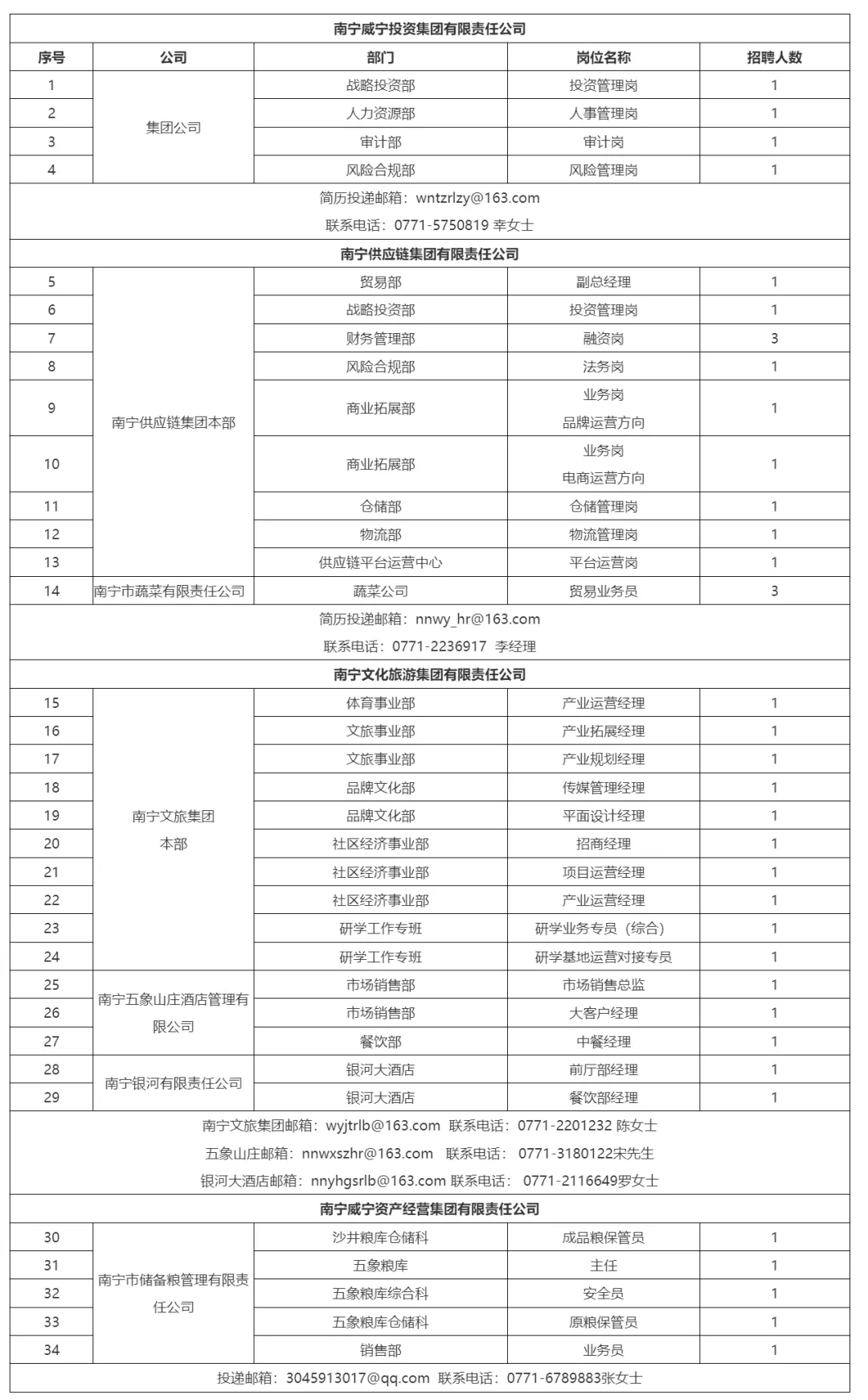 本次招聘采取网上报名方式,报名截止时间为2026年3月20日, 具体岗位要求和简历投递邮箱、联系电话详见附件1,符合条件的人选请下载《南宁威宁集团应聘登记表》(附件2)填写发送相应邮箱。邮件主题及应聘登记表命名为“应聘公司+岗位名称+姓名” ,并选择邮件回执。每位应聘者仅能选择一个职位投递简历,请勿重复投递。