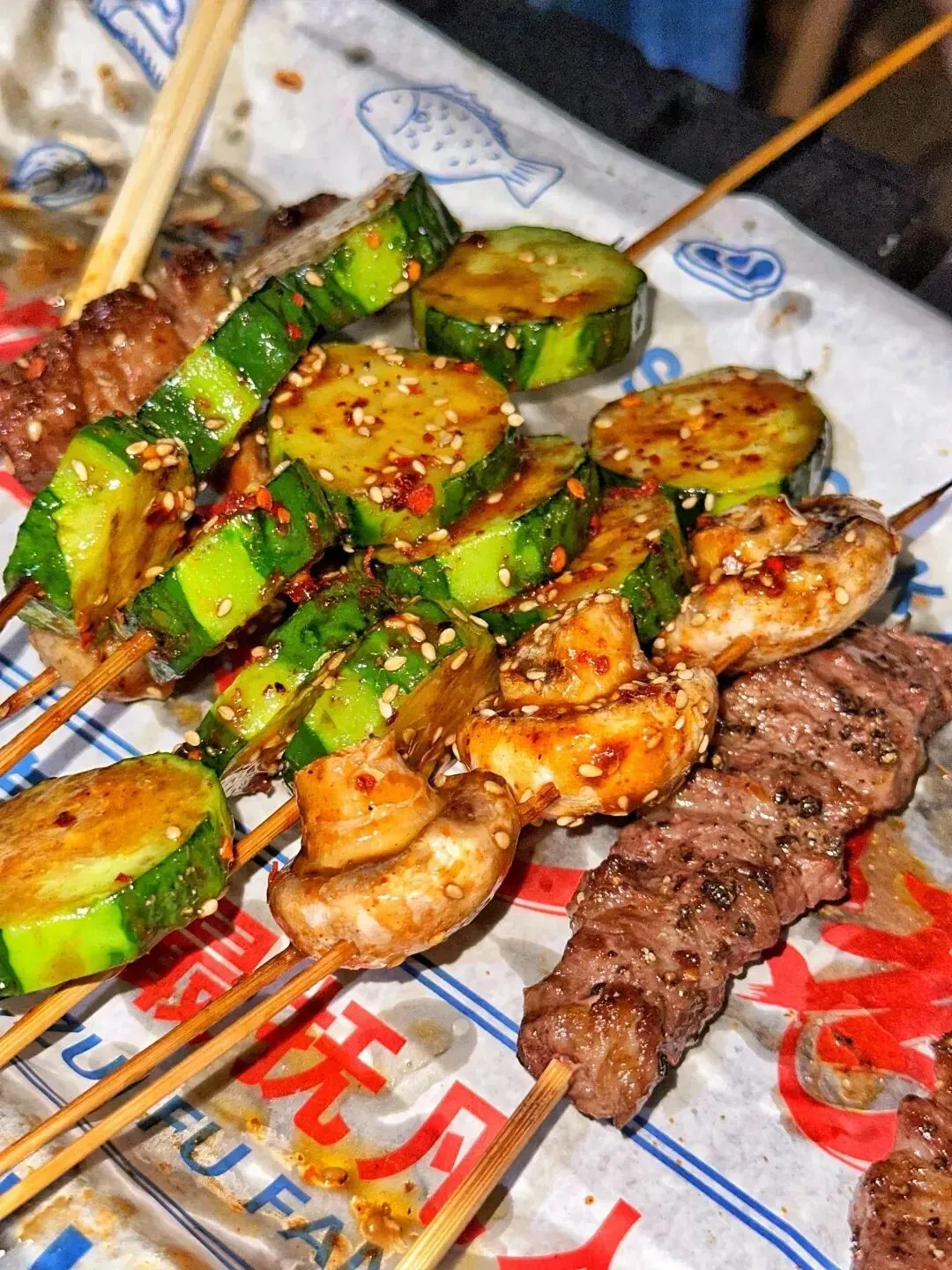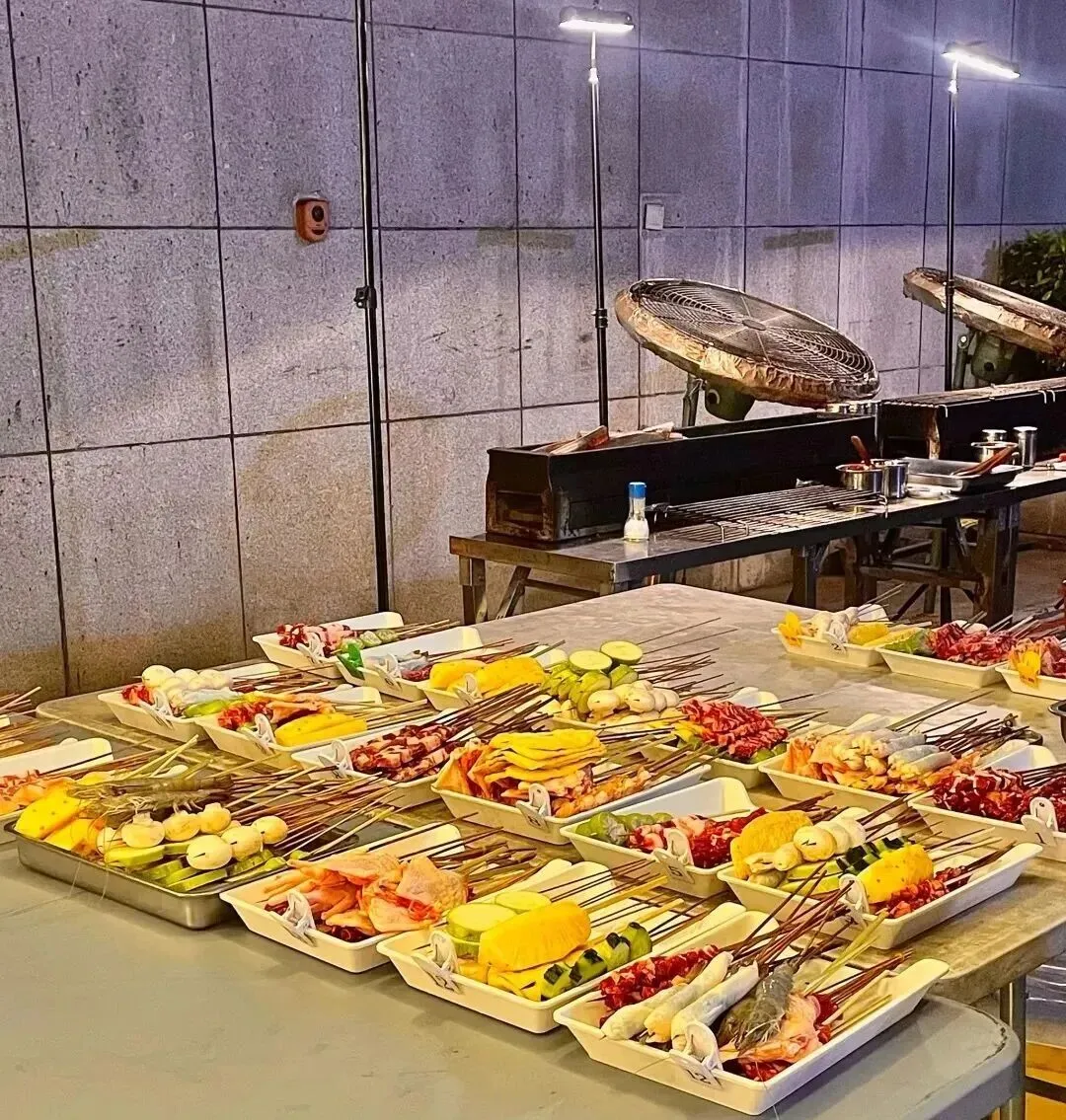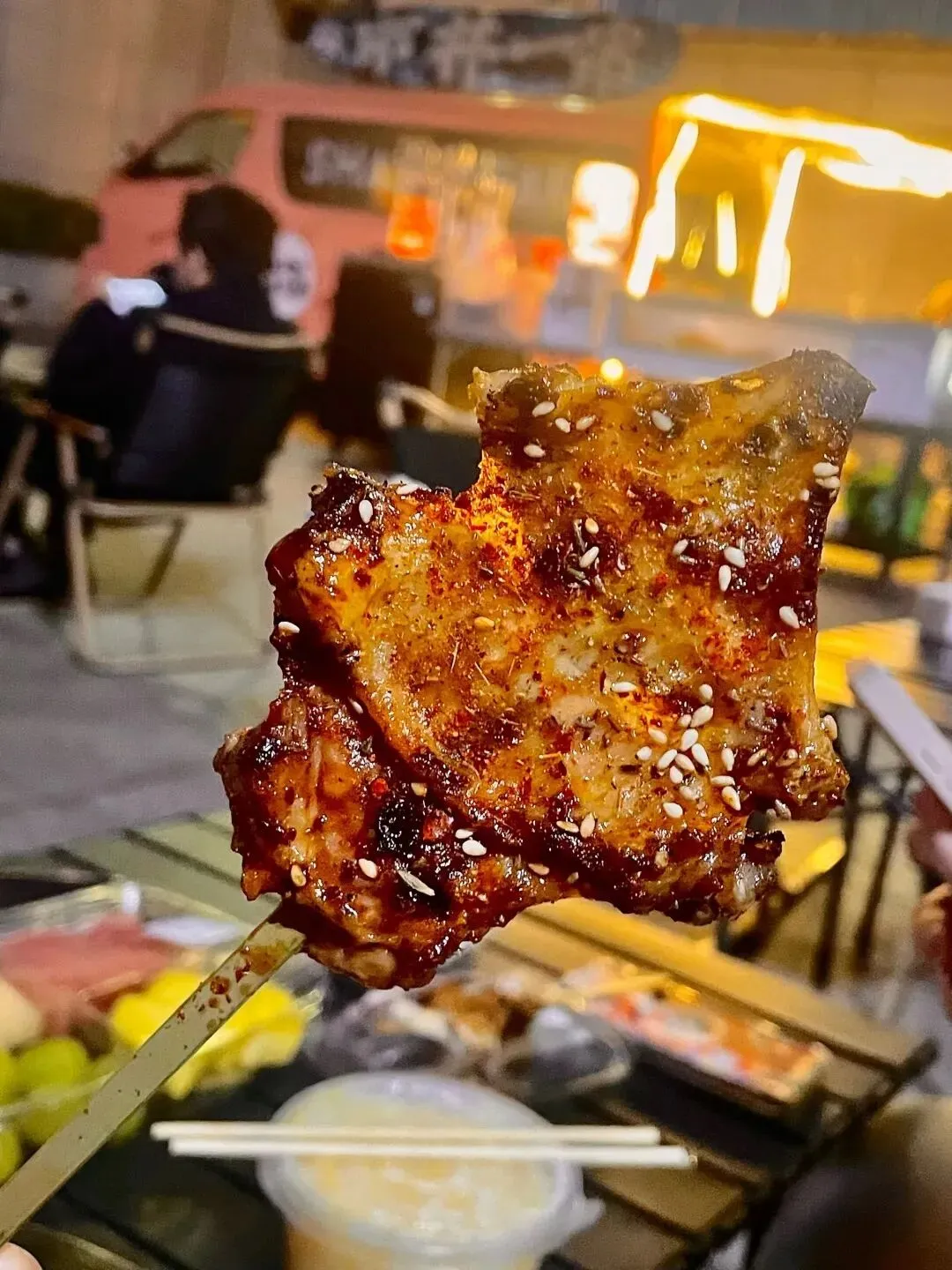 在这半露天的空地上,几张折叠桌,烤炉的烟火气混着晚风,一口肉串下去,开心一整晚。