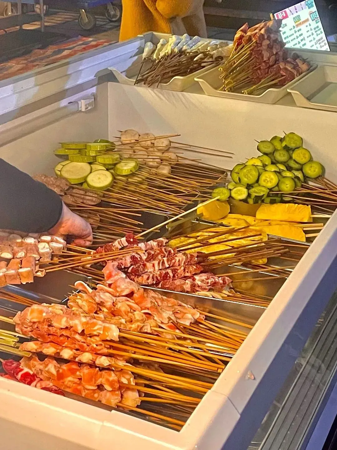 吃到一半,我起身去选串。冰柜里摆满了各种新鲜的食材,每一串都码得整整齐齐。