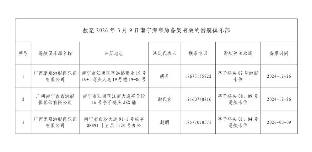 >南宁海事局辖区游艇俱乐部备案情况公示
