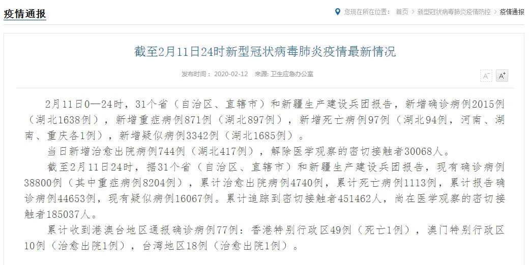 截至2月11日24时,据31个省(自治区、直辖市)和新疆生产建设兵团报告,现有确诊病例38800例(其中重症病例8204例),累计治愈出院病例4740例,累计死亡病例1113例,累计报告确诊病例44653例,现有疑似病例16067例。累计追踪到密切接触者451462人,尚在医学观察的密切接触者185037人。