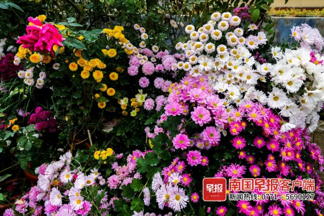 12月6日,南国早报记者来到陈芳家的露台花园看到,低处摆放着色彩缤纷的菊花,架子上摆满了争奇斗艳的月季花,蓝雪花在不起眼的角落爬满墙壁,藤本月季则占领着高处的栏架……