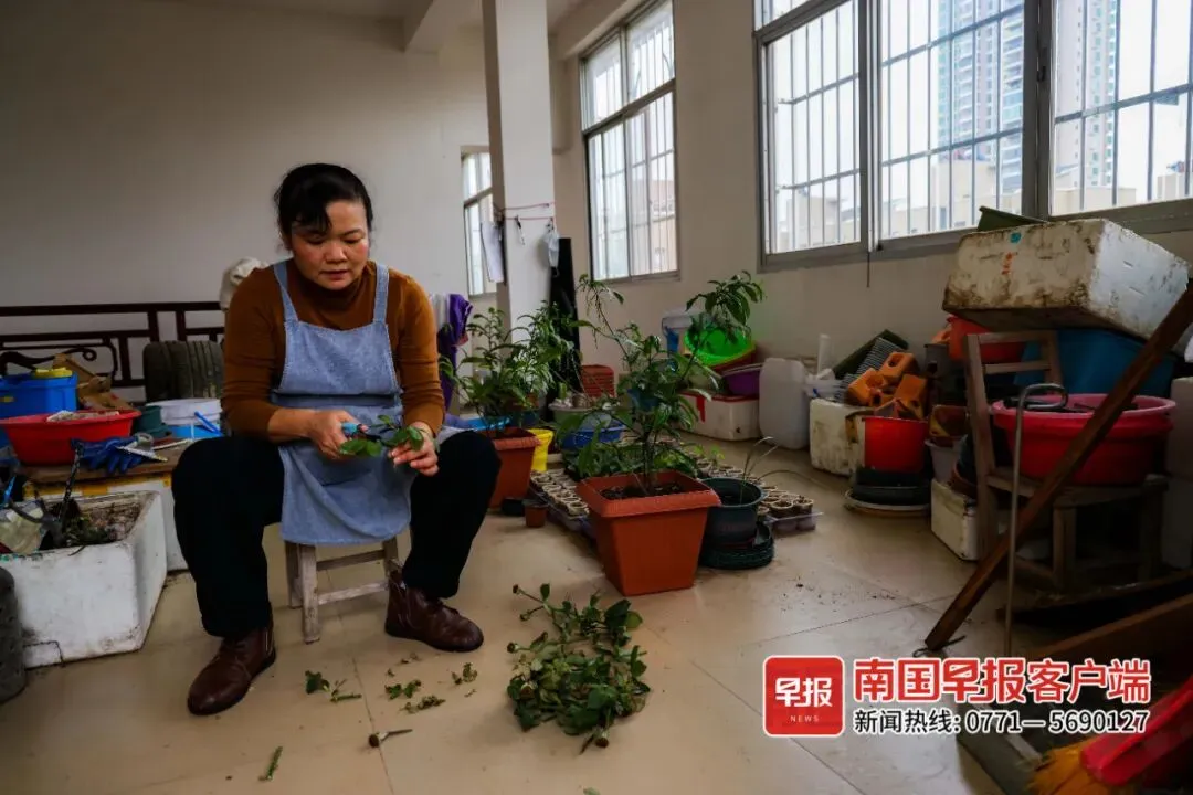 “每年打理花卉的花销要1万多元,所以工具从简。”陈芳笑着说,广西气候温暖而湿润,对于一些特别品种的花卉,更要呵护有加,“百合花、郁金香的种球在萌芽之前需经过低温春化,这样才能分化出花芽。我就把种球放在冰箱里,堆满大半个冰箱,老公也拿我没办法。”今年50岁的陈芳告诉记者,2020年疫情期间,她看到窗外别人家的楼顶开出生机盎然的鲜花,便萌生出把家里闲置露台打造成花园的想法。为了实现心中的“繁花”梦,陈芳在网上下单购买花卉种苗;每次去南宁市区,她都会跑到邕武路的花卉市场“淘宝”,除了购买新鲜的花卉种苗,还收集花店老板丢弃的遭虫害的月季老桩,带回家里慢慢养护。