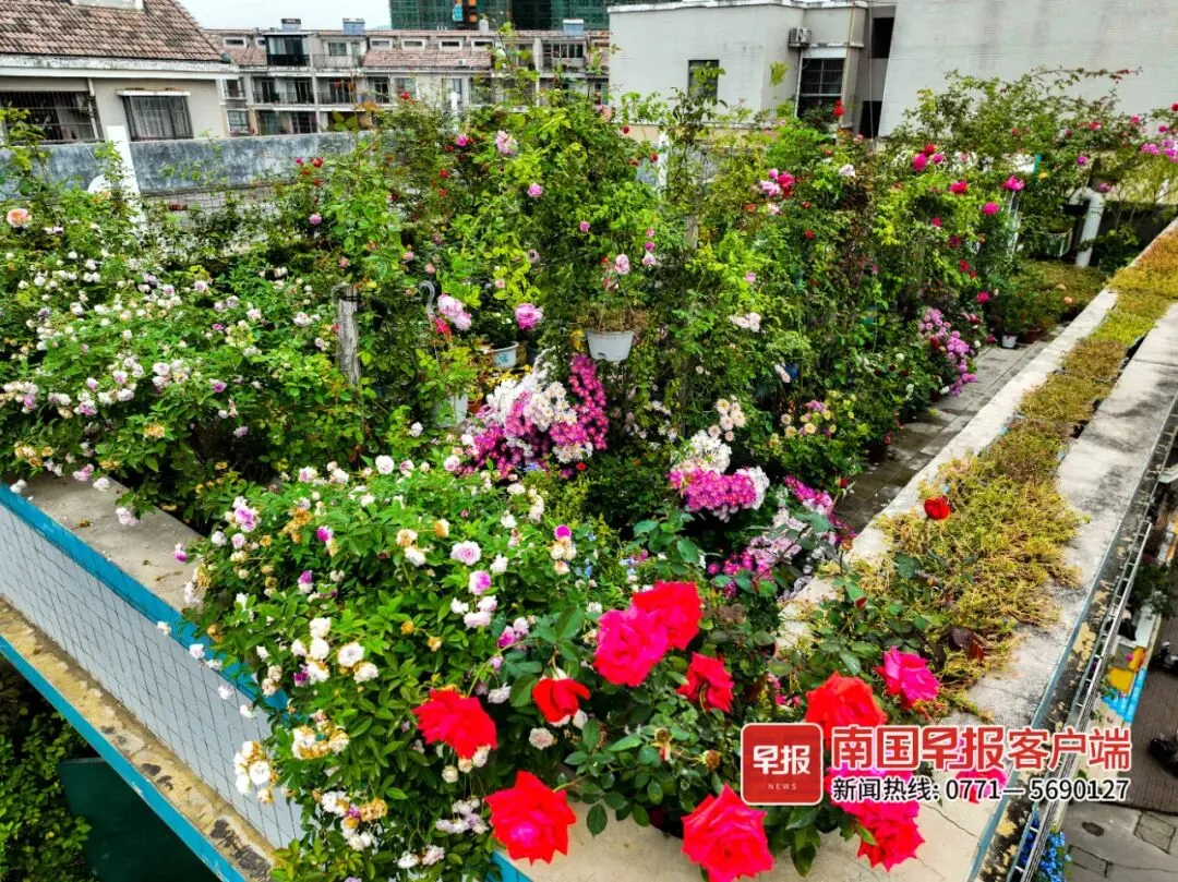陈芳的养花梦想得到了家人的支持。平常,丈夫负责搬运花土、搭建木架等力气活,女儿放假回家也会一起帮忙打理。在一家人的精心呵护下,陈芳梦想中的花园逐渐成形。2020年11月,陈芳在社交平台发布了第一条花卉短视频,随后不间断更新花园实时美景,还经常在评论区与花友互动交流经验,受到不少网友的喜爱和点赞。有时同城花友在后台私信表示想参观花园,陈芳都会热情接待。“现在露台的花盆都摆满放不下了,我就把扦插成活的枝条或花卉植株,免费送给花友。”当初空空如也的楼顶露台,如今变成蜂蝶常驻、花友欢聚的热闹花园。一盆盆鲜花,留下了花园主人热爱生活的痕迹;小小露台,不仅记录下了花开花落的四季变化,也见证了花友间互相赠送“芳香”的美好。戳这里,关注南国早报👇