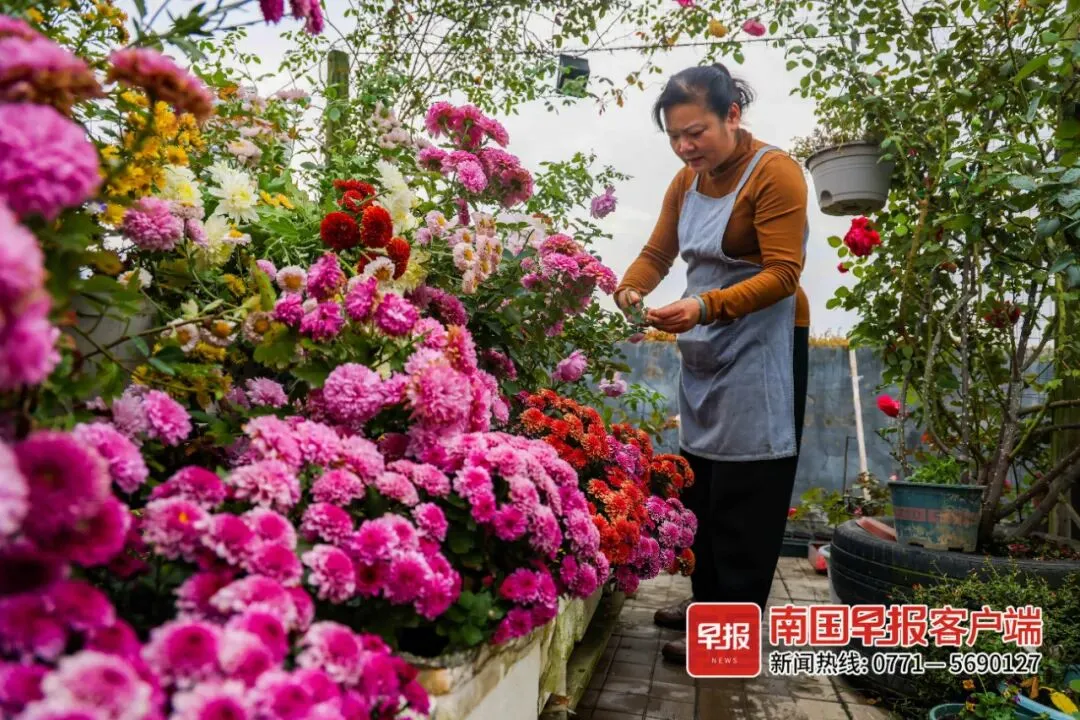 月季花、菊花、角堇花、蓝雪花、矮牵牛花、太阳花……陈芳告诉记者,露台上的花卉有100多种,一年四季都有鲜花盛开。“现在月季和菊花正值花期,光是月季就有30多个品种,菊花有20多个品种,等来年春天天气回暖,那才是花园最美的季节。”每天天蒙蒙亮,陈芳便开始忙碌起来,扫花瓣、浇水、剪枝、拔草、扦插,一忙就是两三个小时,日复一日重复花园打理工作。“等大寒节气过后,是花园最繁忙的时候。”为了降低春天爆发病虫害的概率,每年冬末陈芳要进行“清园”,薅秃月季的叶子,以此来清除潜伏在枝叶准备越冬的成虫或虫卵。