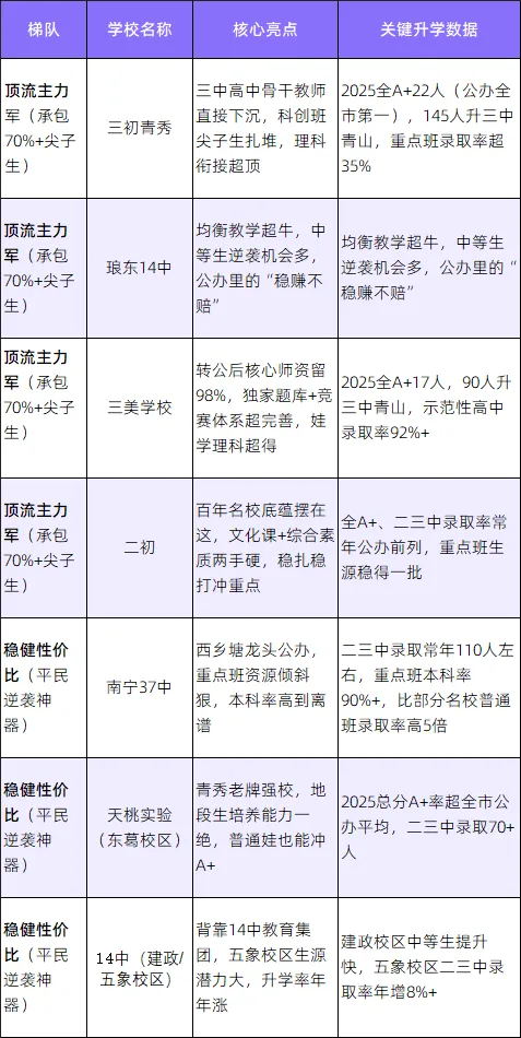 优先冲顶流/稳健梯队的学校,重点看有没有竞赛班、分班考衔接课程、和高中部的资源联动,这些才是实打实的硬货,别被 “名校” 两个字骗了,花冤枉钱还耽误娃!