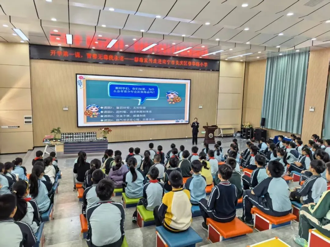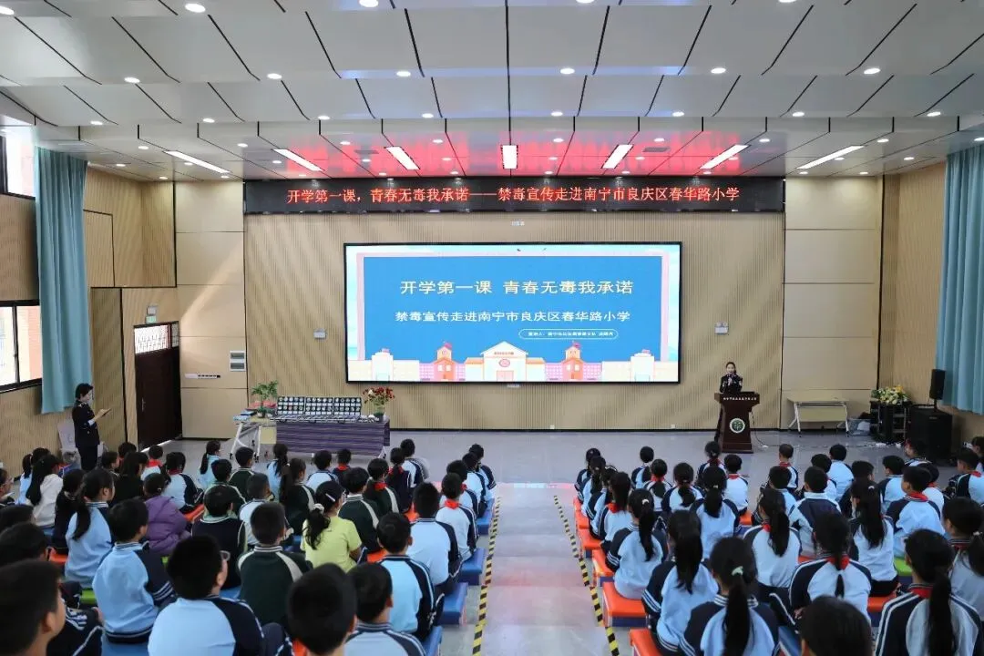 为进一步加强青少年禁毒宣传教育,筑牢校园禁毒安全防线,近日,南宁市禁毒工作办公室走进南宁市良庆区春华路小学,开展了一场生动鲜活的“开学第一课”禁毒宣传活动,引导青少年树立“珍爱生命、远离毒品”的坚定信念。
