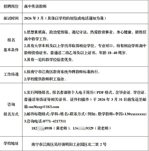 南宁市第五十六中学是南宁市江南区的一所公立高中,创建于1980年,历史悠久,环境优美。“以德立校,质量兴校,科研强校”是我校的办学理念。教师队伍团结奋进,是促进教职工成长的地方。根据学校的发展,现向社会公开招聘。