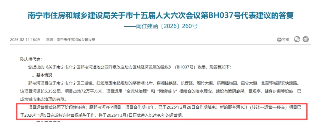 日前,官方消息称,原那考河PPP项目,项目合作期已于2025年2月28日结束,新的那考河TOT(转让—运营—移交)项目已于2026年1月5日完成特许经营权采购工作。