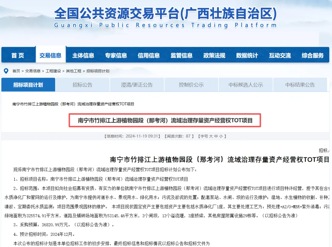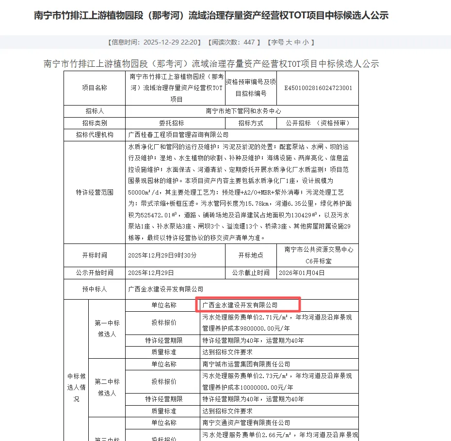 ①广西金水建设开发有限公司中标成为新的特许经营单位;