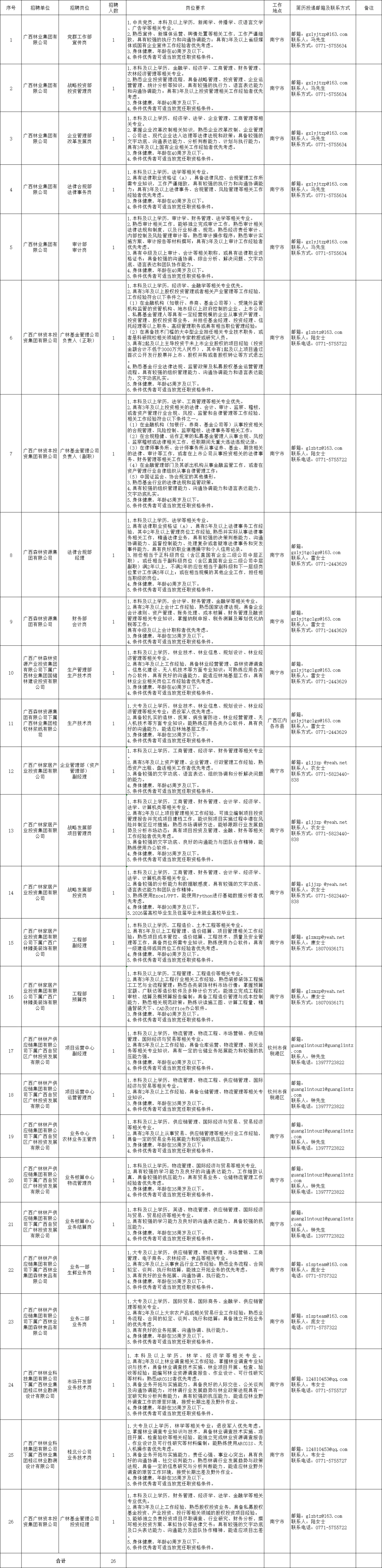 广西林业集团有限公司2026年公开招聘公告 (第一批)西林业集团有限公司(以下简称广林集团)于2008年10月由自治区党委、政府批准设立,是自治区人民政府直属大型国有全资企业。自治区党委、政府赋予广林集团五大使命:建设沿海林浆纸一体化项目,打造林浆纸“航母”;打造企业龙头,做强做大林业产业;运营监管资产,提高经营效益;搭建投融资平台,拓宽发展领域;参与生态建设,维护生态安全。 一、招聘岗位及人数 本次共计划招聘广西林业集团有限公司本部及下属企业岗位人员26人。具体招聘岗位及要求详见《广西林业集团有限公司2026年第一批公开招聘计划》(附件1)。 二、招聘基本条件 (一)自觉坚持以习近平新时代中国特色社会主义思想为指导,深刻领悟“两个确立”的决定性意义,增强“四个意识”、坚定“四个自信”、做到“两个维护”,坚决贯彻执行党的路线方针政策。 (二)具有良好的职业操守和个人品行,认真贯彻落实中央八项规定及其实施细则精神,坚决反对“四风”,诚实守信,廉洁从业。 (三)具备招聘岗位所需的专业知识和相关技能。 (四)具有正常履行职责的身体条件和良好的心理素质。 三、招聘程序 (一)报名。每名应聘者只能选报一个岗位,并将《广西林业集团2026年第一批公开招聘报名人员信息表》(附件2)、《广西林业集团有限公司应聘登记表》(附件3)的可编辑电子版,及居民有效身份证、学历学位证书、专业技术资格证书、获奖证书等材料扫描件打包发送至招聘指定邮箱,邮件主题及材料包名称以“应聘单位+岗位名称+应聘者姓名”命名。报名时间:2026年3月10日—2026年3月19日,逾期不再受理。 (二)资格审核。用人单位根据岗位任职要求,对应聘者进行资格审核。应聘者应如实提供应聘资料,如发现有弄虚作假行为的,取消应聘资格。 (三)综合考评。根据资格审核情况,择优确定入围综合考评人选。具体时间、地点、方式等以通知为准,通知主要以电话或短信的方式,请应聘者保持通讯畅通。……