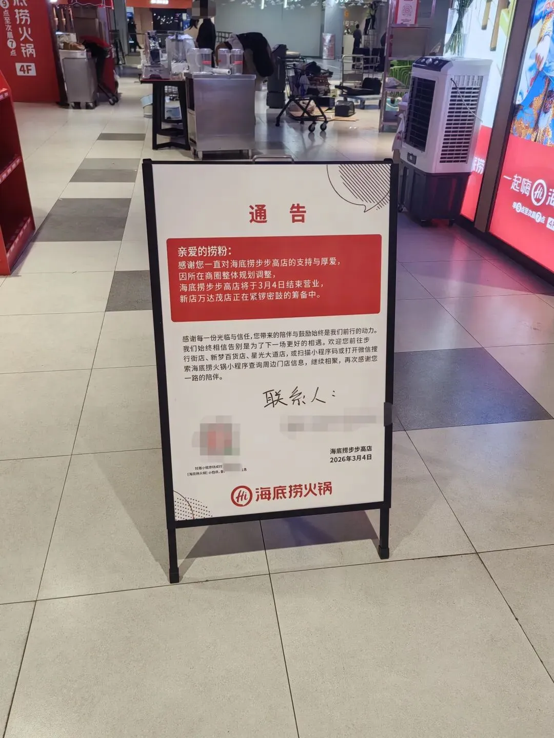 告示的大致内容是这家海底捞门店从2026年3月4日日停止营业,并且告知顾客可以到南宁的其他门店进行消费!