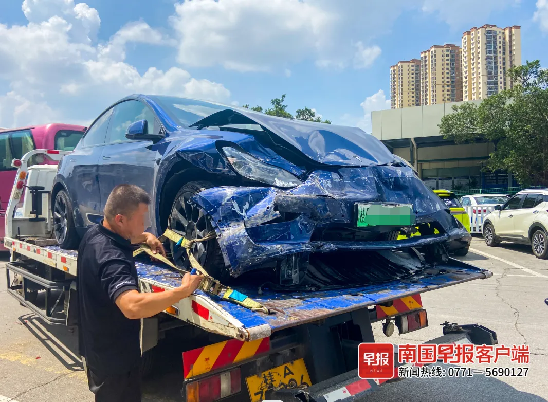 ▲一辆特斯拉失控撞上数车后车头受损,被装上平板车运走。本文图片为南国早报记者 游拥军摄