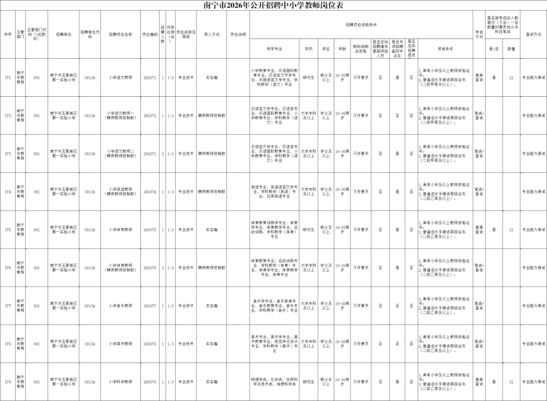报名成功人员自行登录南宁市教育局网站进入“南宁市2026年公开考试招聘中小学教师”专题的报名系统,打印笔试准考证(直接面试、直接考核岗位除外,下同)、报名登记表。报考人员按照笔试准考证上指定的时间、地点,携带本人有效居民身份证原件(或考场辖区派出所出具的有效临时身份证明)和笔试准考证参加笔试,两证缺一不可。