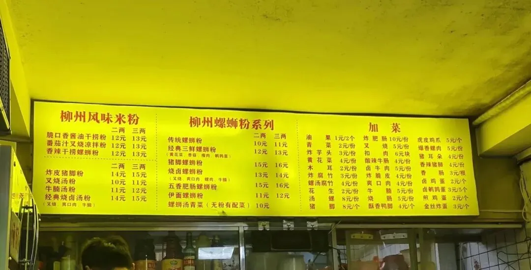 店里不大,只有几张桌子,墙上贴着泛黄的菜单,上面写着“正宗传统螺蛳粉”“烧卤干捞粉”“炸皮猪脚粉”。