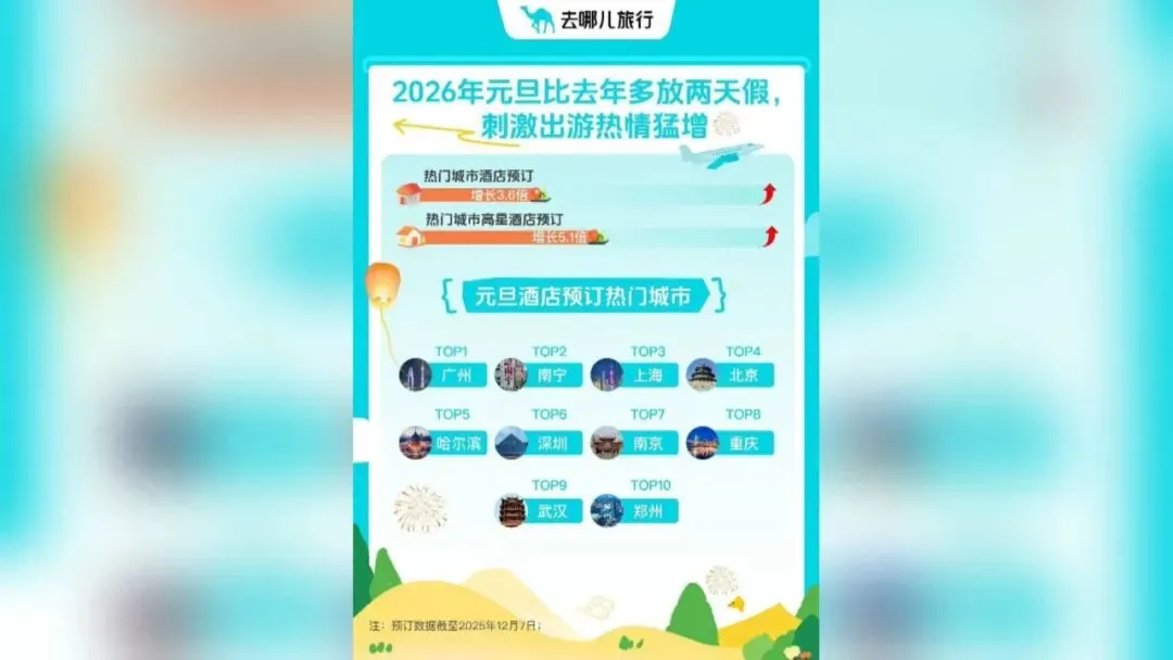 元旦假期临近,2026年元旦迎来3天小长假。相较于2025年元旦仅1天的假期,今年新增的2天假期让出行计划更从容。最近记者从多家旅行社了解到,元旦假期北方 “冰雪游” 热度不减。而南宁则凭借明星演唱会、暖冬气候成功 “出圈”,跻身元旦酒店预订热门城市榜二,仅次于广州,成为跨年夜最亮眼的 “黑马”。