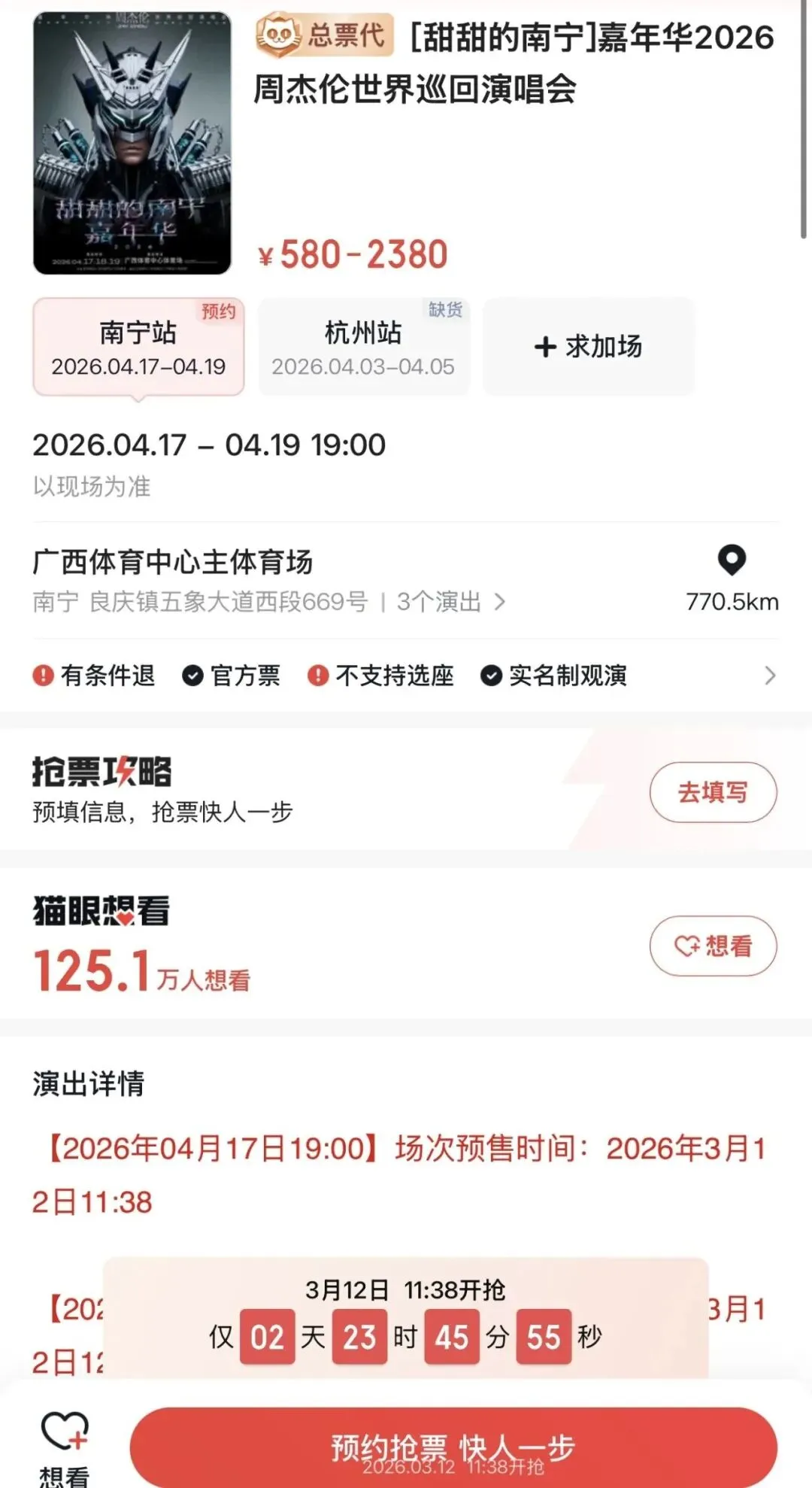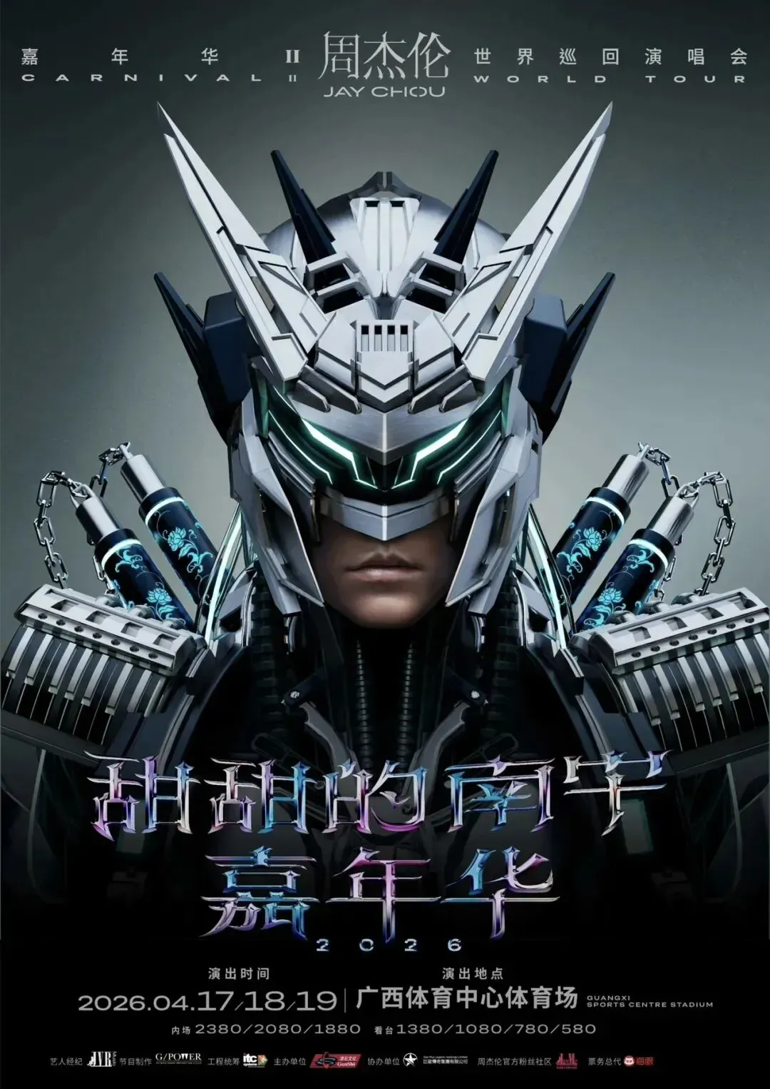 另据广西文化和旅游厅消息,周杰伦嘉年华世界巡回演唱会南宁场将于2026年04月17—19日在广西体育中心主体育场举行,演唱会时间正值广西三月三。