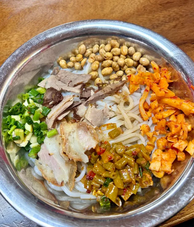 桂林米粉切粉或圆粉,配卤水、酸豆角、花生、酱肉。早市小摊、烟火巷子最好吃,蘸料辣椒油任选。