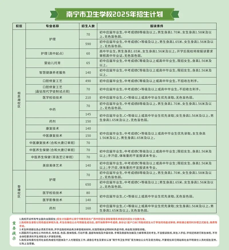 学校总占地面积586亩,拥有相思湖和黎塘两个校区,校舍建筑面积23.11万平方米,实训场地面积5.6万平方米;学校附属医院(南宁市第九人民医院)是国家三级综合医院,另有8家教学医院,9个“双师型”教师培养基地,2家产教融合产业学院(南宁市卫生学校晶钻齿科产业学院和菲洛芝中医康养产业学院),校内外实训实习基地达110多个。学校师资力量雄厚,有3个南宁市级名师成长工作室、1个自治区级名班主任工作室,教职工630余名,拥有市级新世纪学术和技术带头人3人,市级学科带头人5人,市级骨干教师及“双师型"教师158名,中高级专任教师138名。在校学生1.3万人,每年为社会输送三千多名毕业生,其中获得“白求恩奖章”“南丁格尔奖章”“全国五一劳动奖章”“全国最美医生"称号的杜丽群、获得“全国最美乡村医生”称号的李前锋、获得广西“五一巾帼标兵”称号的张小霞等均是我校优秀毕业生的代表。