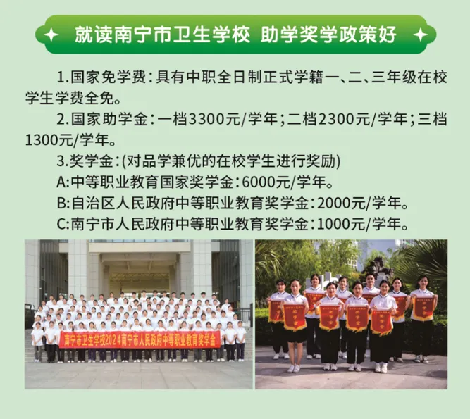 南宁市卫生学校是公办的国家级重点中等职业学校、国家首批中等职业教育改革发展示范校、广西中等职业教育特色示范学校、广西第一批四星级学校、“广西优质学校”“广西优质专业”立项建设学校;是首批全国职业院校健康服务类示范专业点、教育部“1+X”职业技能证书制度试点院校、自治区级养老服务人才培养基地和南宁市老年健康人才培训基地。学校始建于1972年,历史悠久,环境优美,教学楼、实训楼、公寓楼、阳光餐厅、图书馆、学术报告厅、学生活动中心、室内体育馆、塑胶跑道及标准足球运动场等场所配备齐全,数字化赋能,是莘莘学子成就医学梦想的八桂名校。