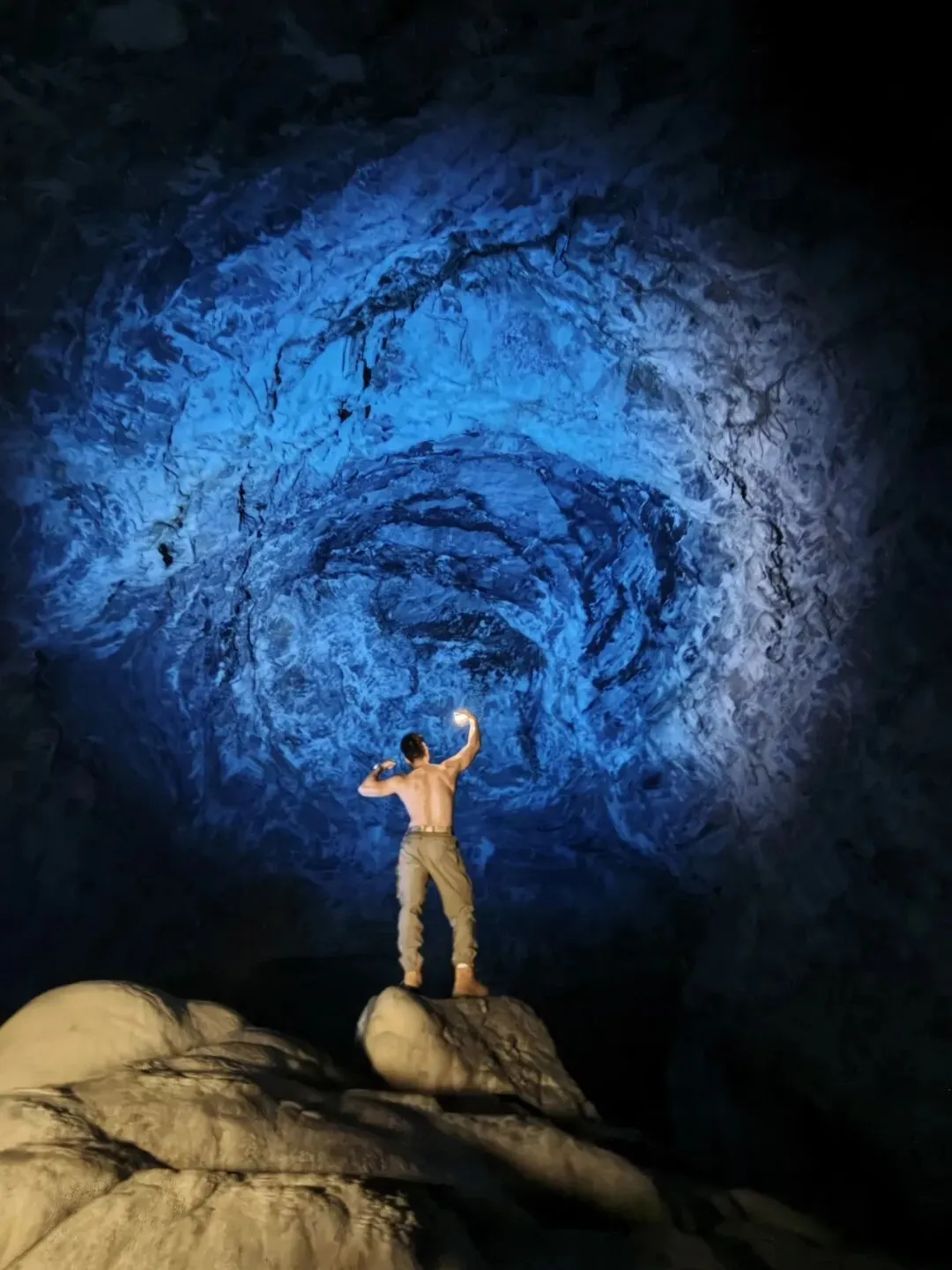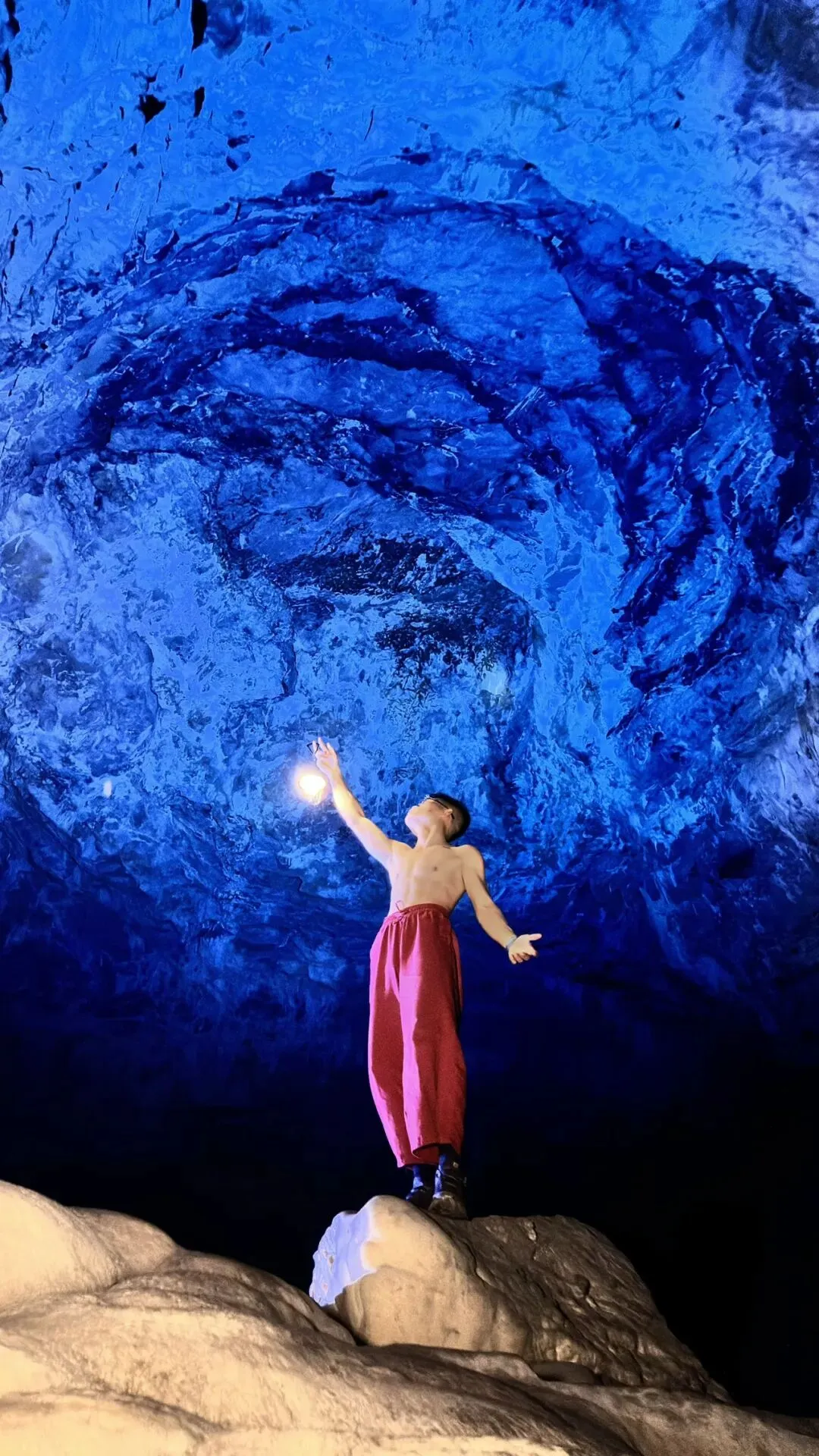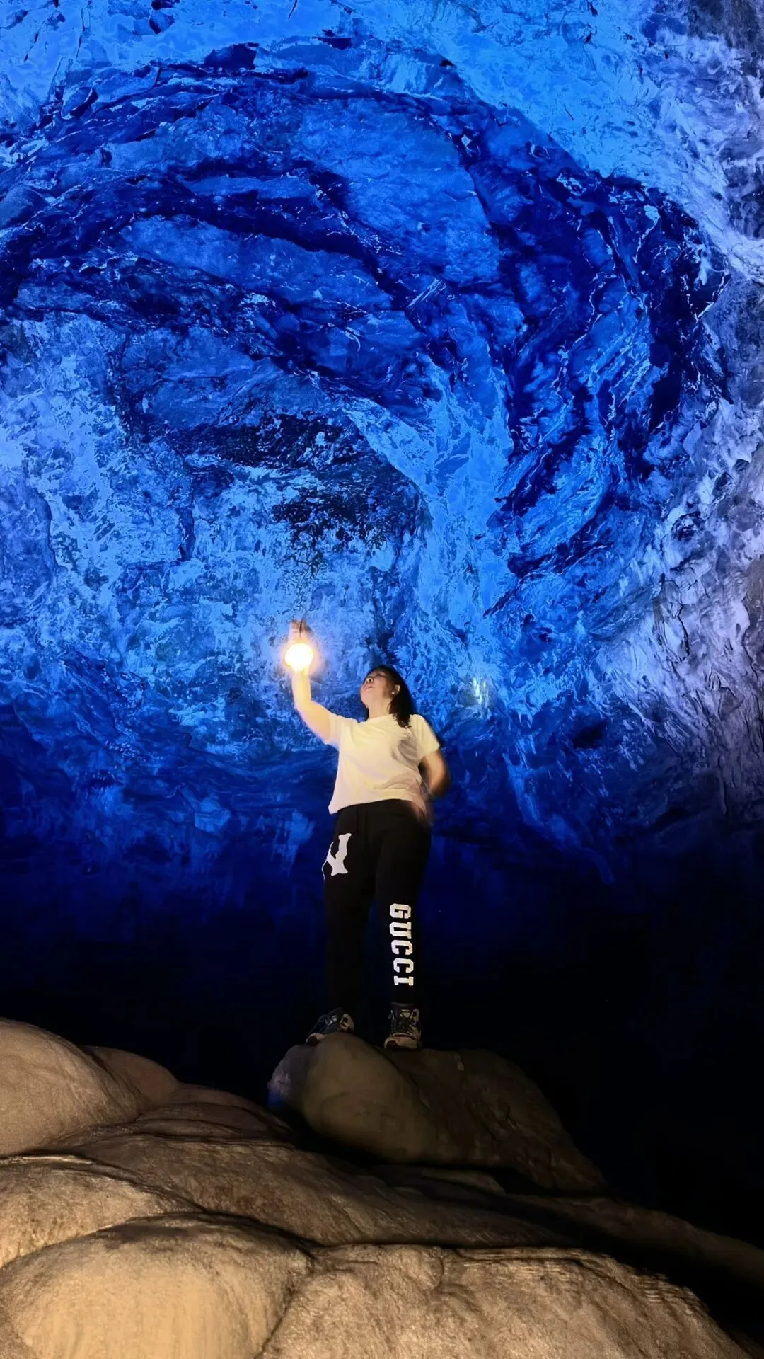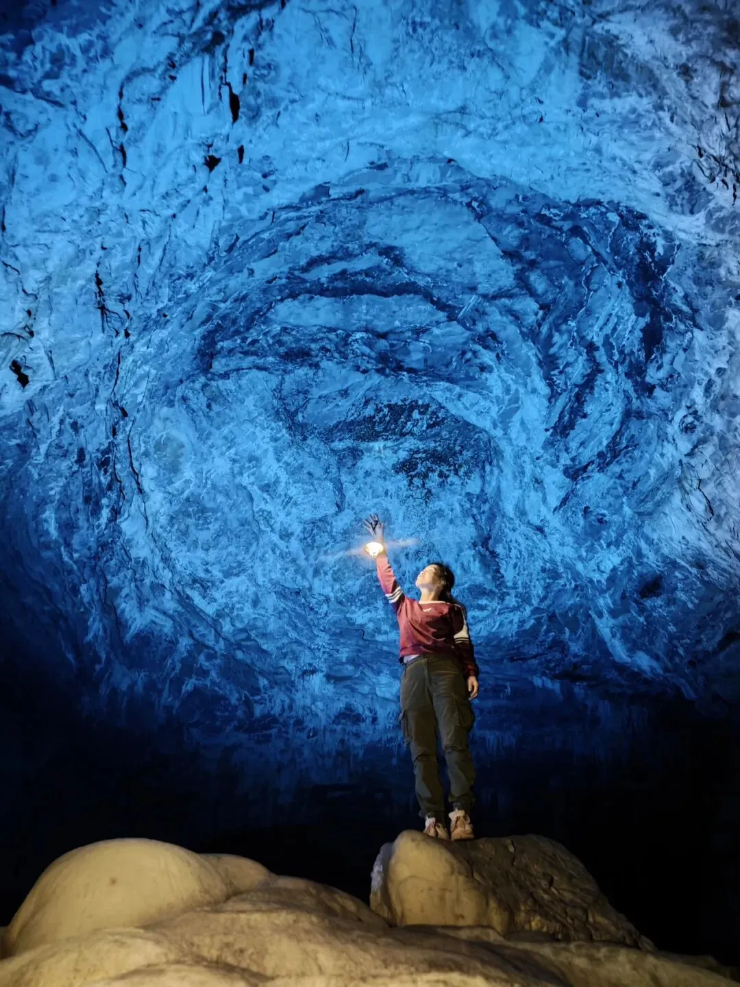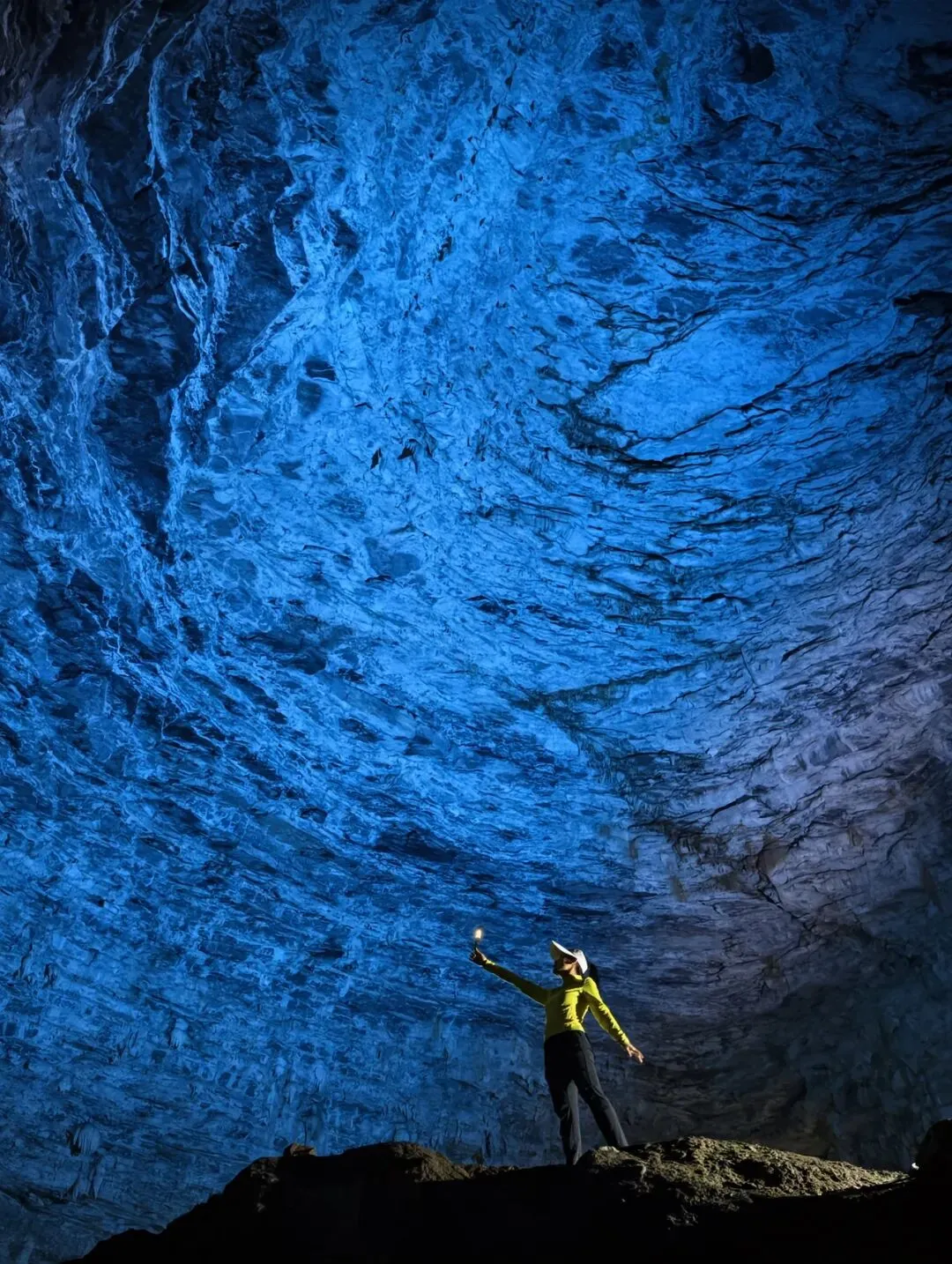 最震撼的蓝色“星空”——幽蓝灯光打在凹凸不平的岩壁上,层层晕染,像浩瀚宇宙里的星云漩涡。站在岩石上,抬头仰望,仿佛置身太空星际,伸手就能触碰这片流动的蓝。拍照全靠电筒补光,人物与蓝色岩壁形成冷暖对比,随手一拍都是氛围感拉满的大片。在灯光的加持下,星河倒悬,深邃磅礴,人似站在广袤的银河下,显得如此渺小。