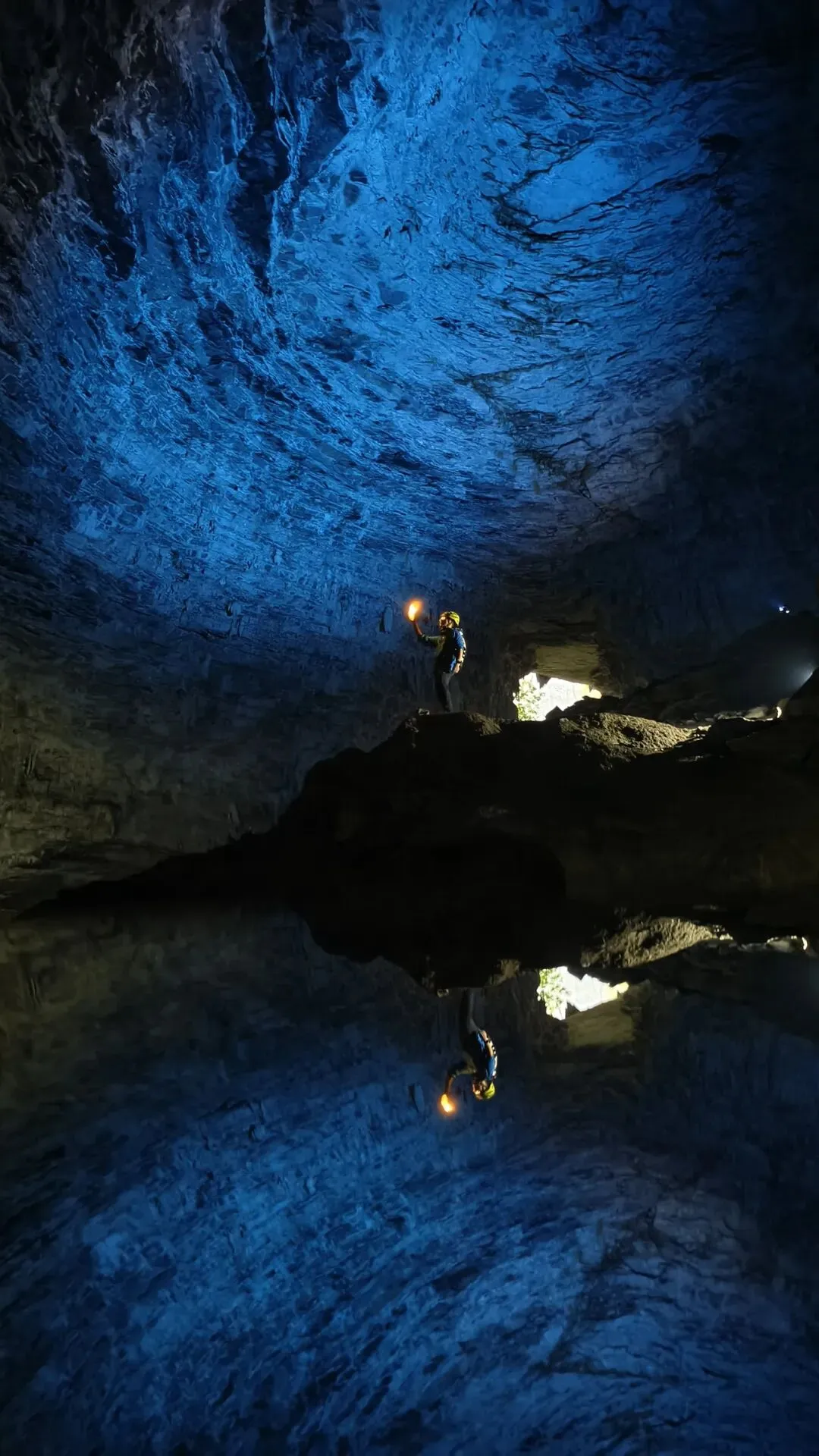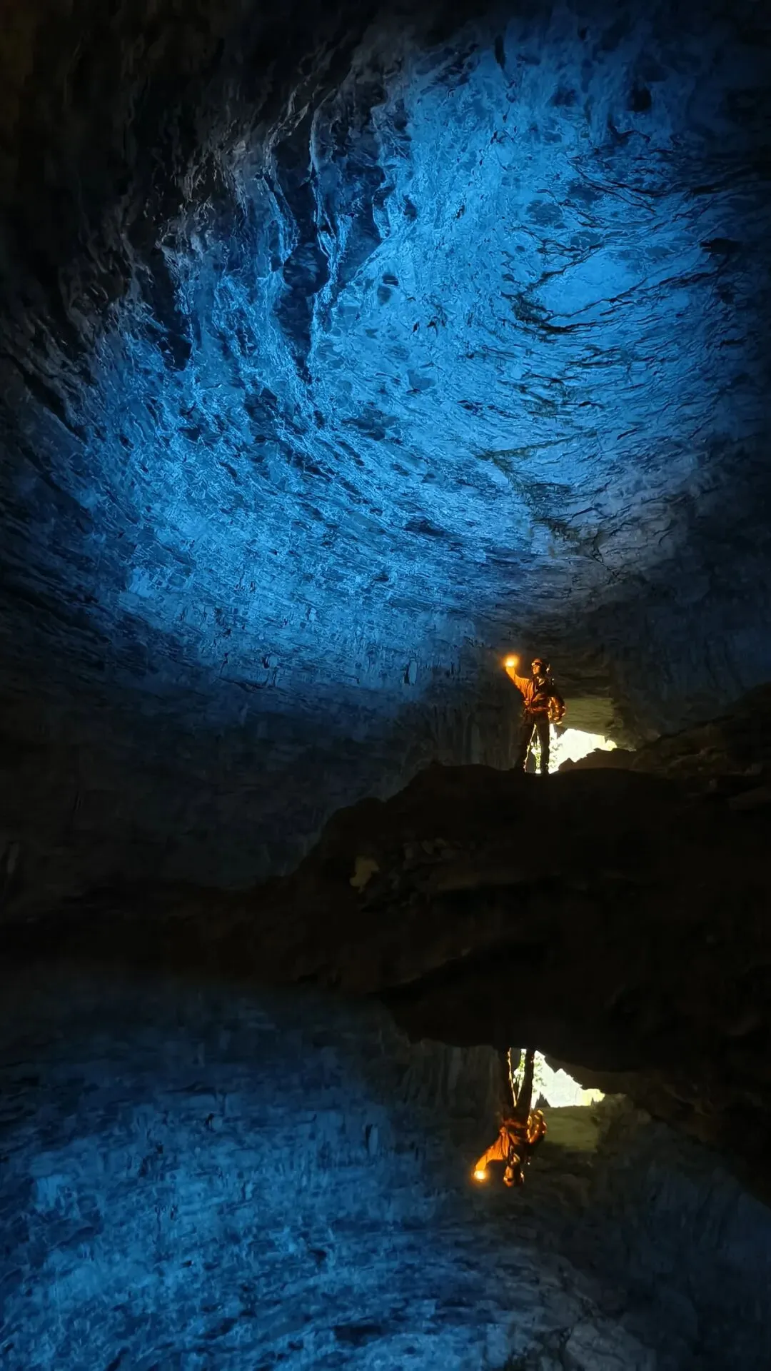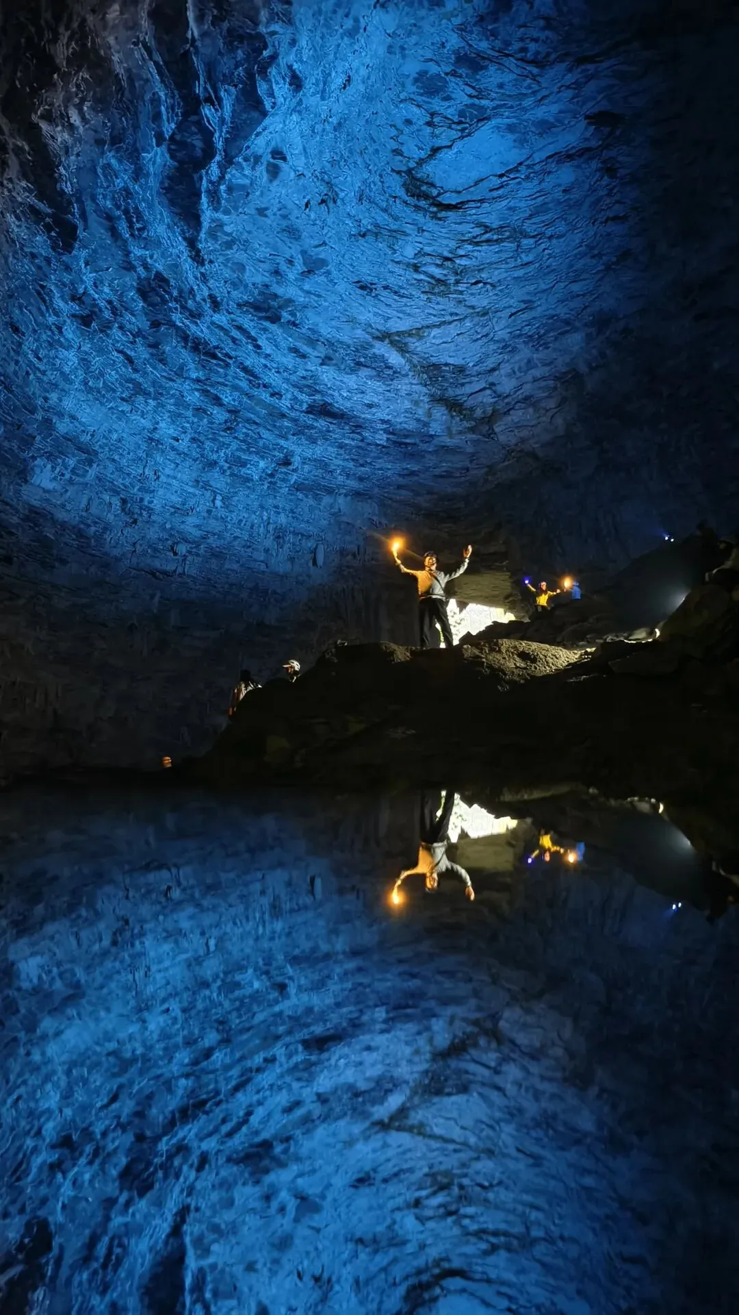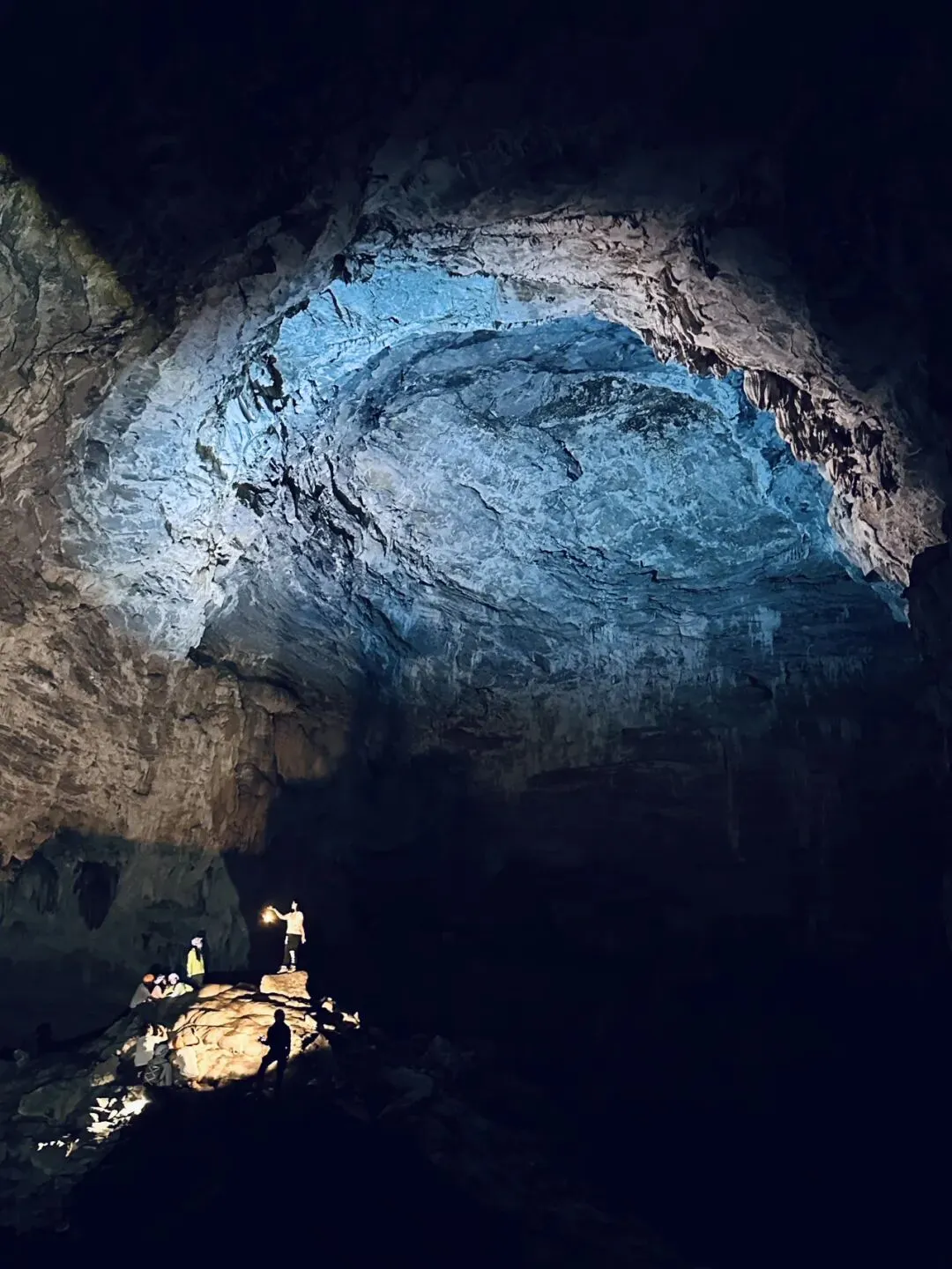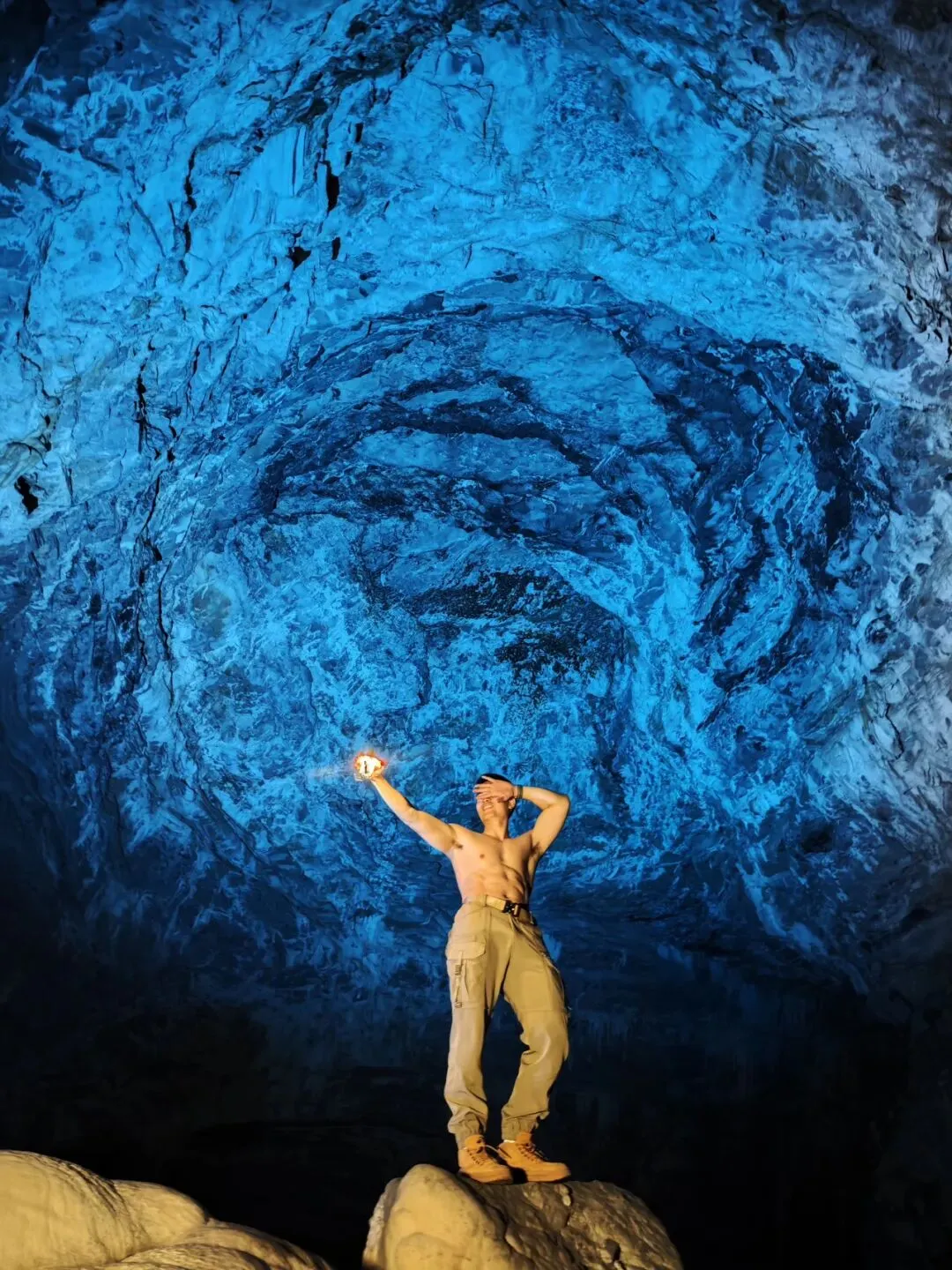 最震撼的蓝色“星空”——幽蓝灯光打在凹凸不平的岩壁上,层层晕染,像浩瀚宇宙里的星云漩涡。站在岩石上,抬头仰望,仿佛置身太空星际,伸手就能触碰这片流动的蓝。拍照全靠电筒补光,人物与蓝色岩壁形成冷暖对比,随手一拍都是氛围感拉满的大片。在灯光的加持下,星河倒悬,深邃磅礴,人似站在广袤的银河下,显得如此渺小。