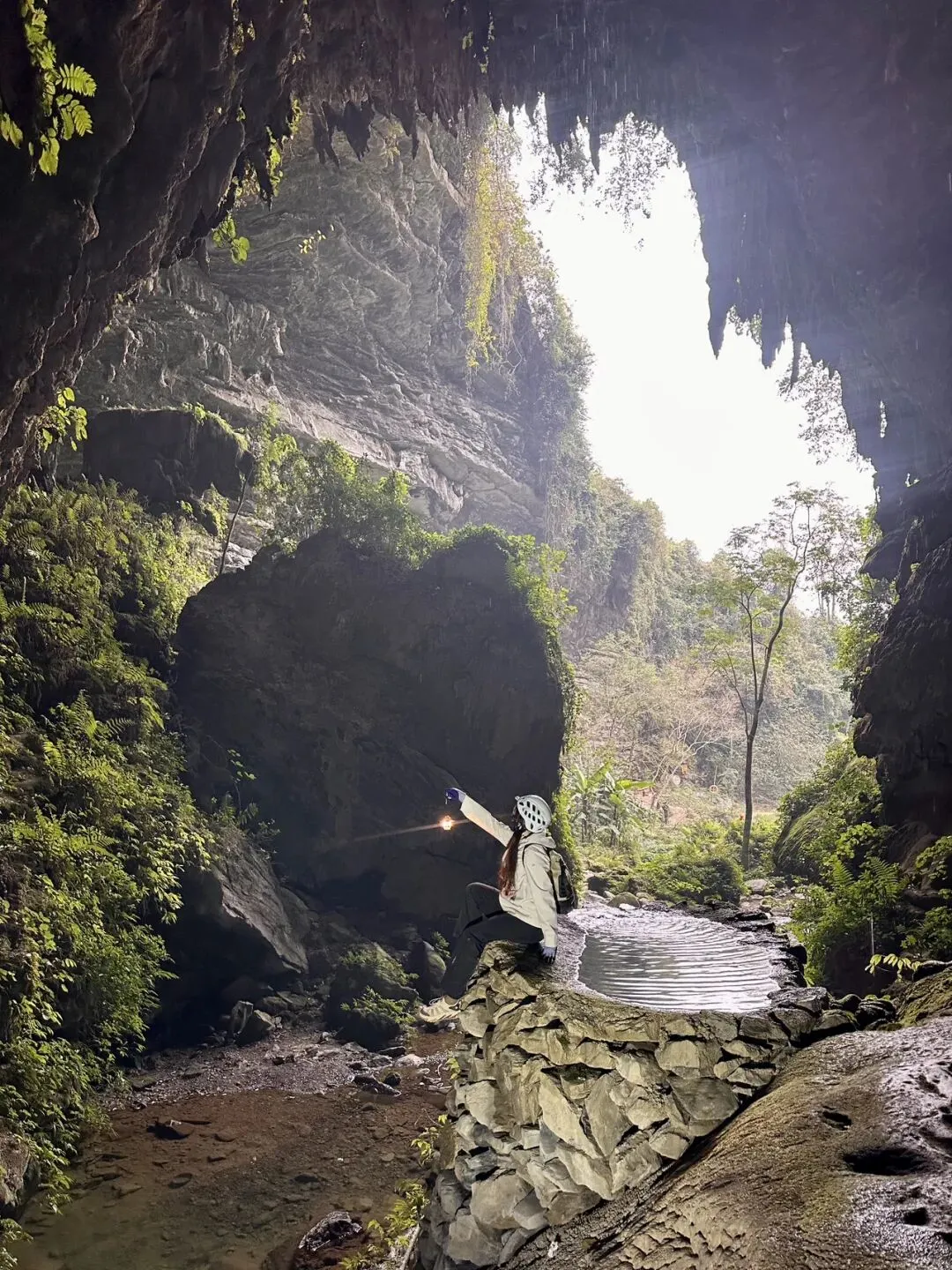 内敢洞的入口,是天然的取景框,一半是洞外葱郁山林,一半是洞内幽暗秘境,钟乳石水珠垂落,溪水流淌,开启地心探险的门扉。↓