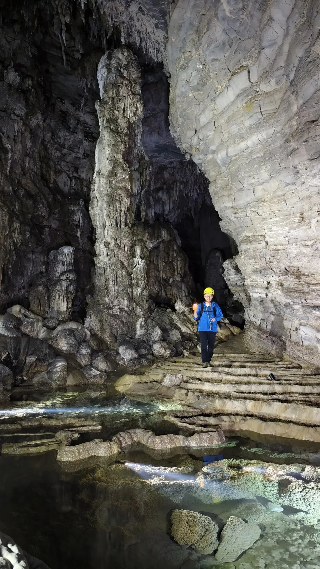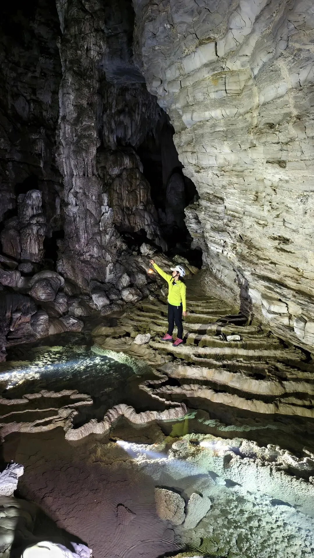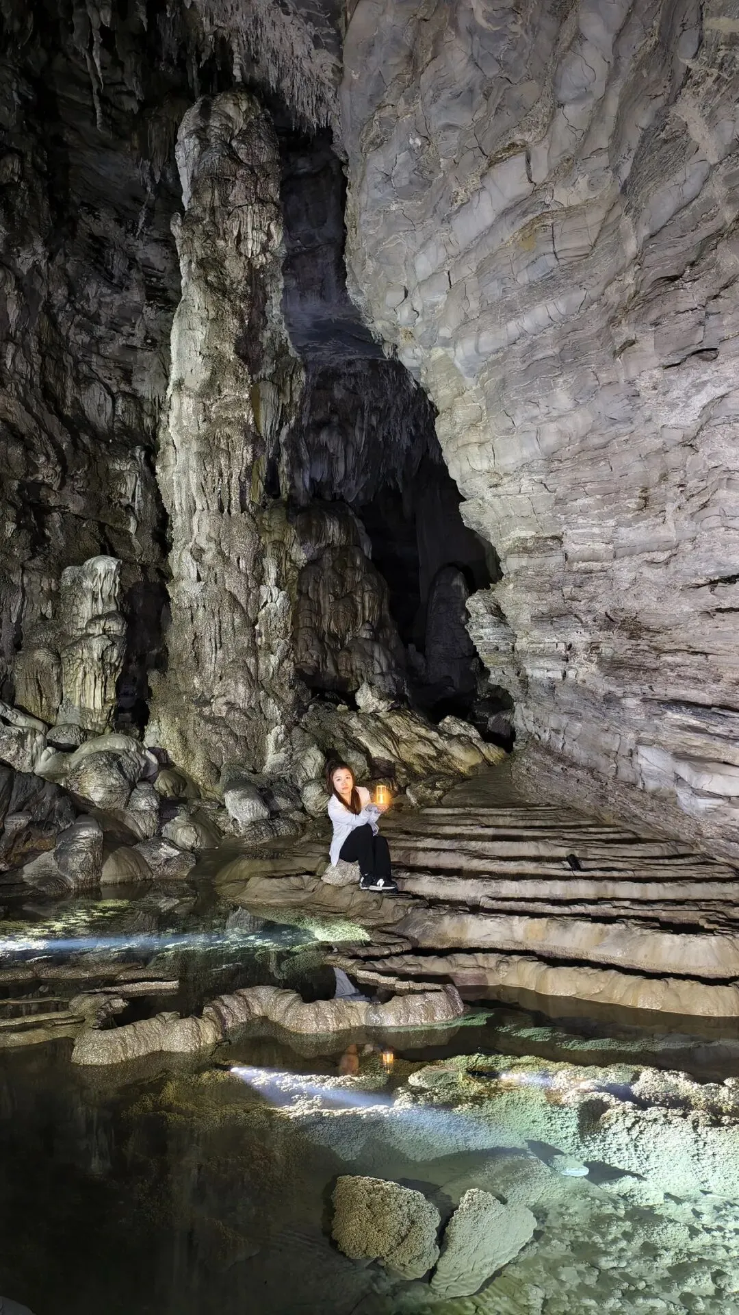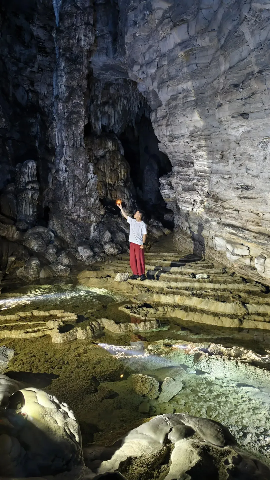 在内敢洞的尽头,有另一个洞口,模特伫立在高耸的岩石之上,摄影师于岩石下仰拍,蓝色星球效果与镜像结合,虚实重叠,将自然与人完美框进照片里。在洞中央山坡右侧,有一大片钙化池,清澈的水面像天然镜子,倒映着钟乳石与灯光,泛着温润的绿光。层层叠叠的钙化池像梯田,波光粼粼间尽显溶洞的柔美。停车场收费10元,有干净的卫生间和水源,适合露营,我们傍晚5点半进洞,八点出来,村民守在洞口,反复确认洞内没人才离开,他说每天都要确认,生怕游客遇到危险。