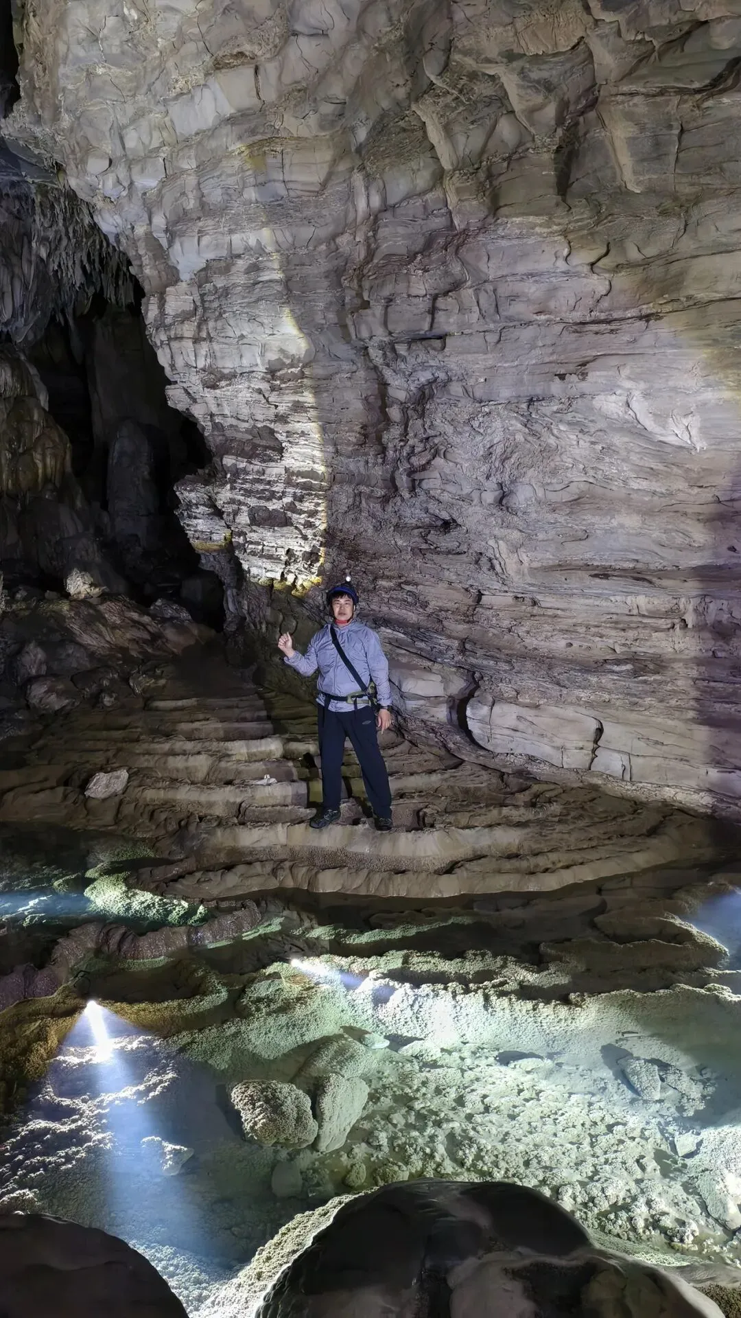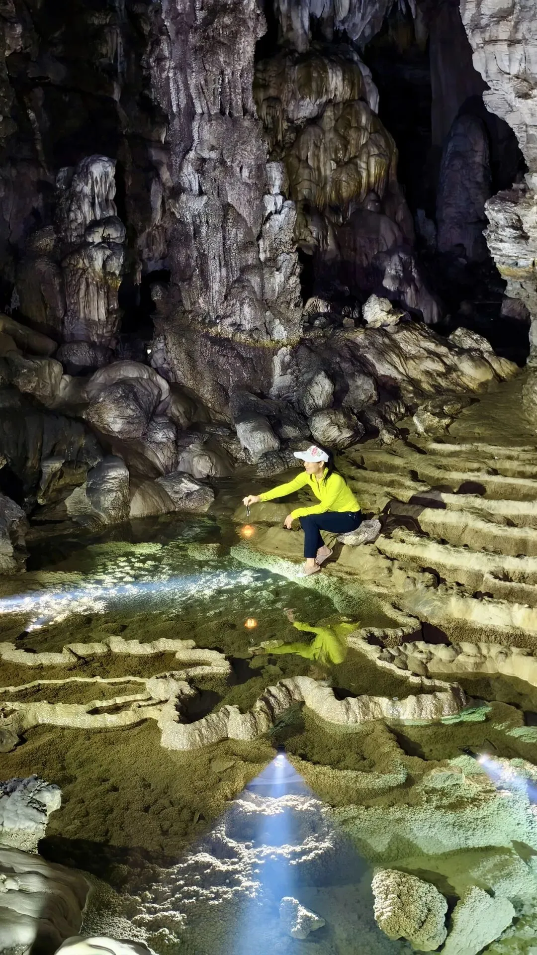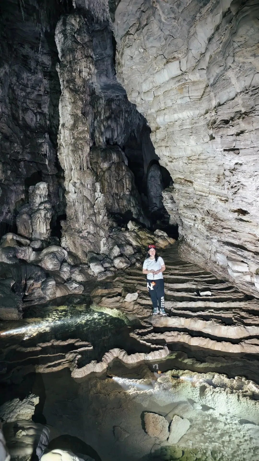 在内敢洞的尽头,有另一个洞口,模特伫立在高耸的岩石之上,摄影师于岩石下仰拍,蓝色星球效果与镜像结合,虚实重叠,将自然与人完美框进照片里。在洞中央山坡右侧,有一大片钙化池,清澈的水面像天然镜子,倒映着钟乳石与灯光,泛着温润的绿光。层层叠叠的钙化池像梯田,波光粼粼间尽显溶洞的柔美。停车场收费10元,有干净的卫生间和水源,适合露营,我们傍晚5点半进洞,八点出来,村民守在洞口,反复确认洞内没人才离开,他说每天都要确认,生怕游客遇到危险。