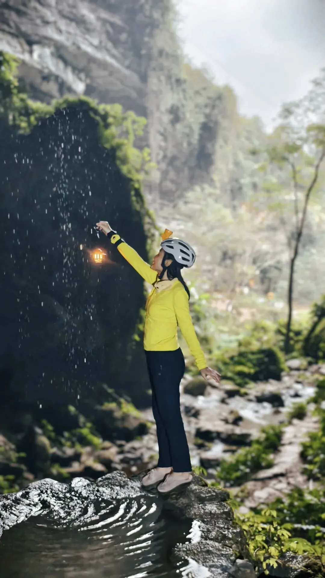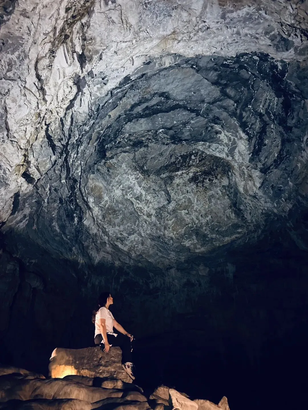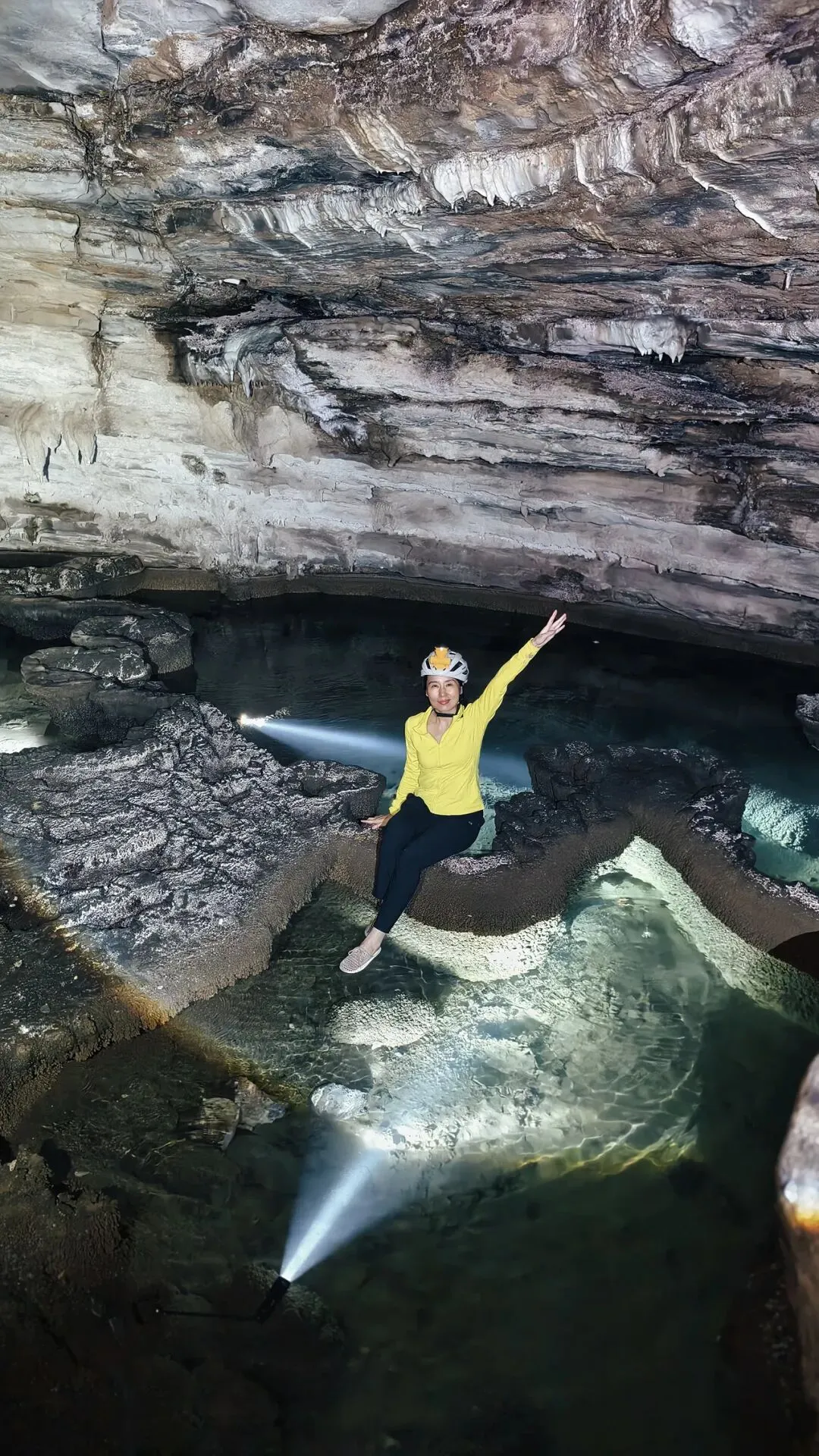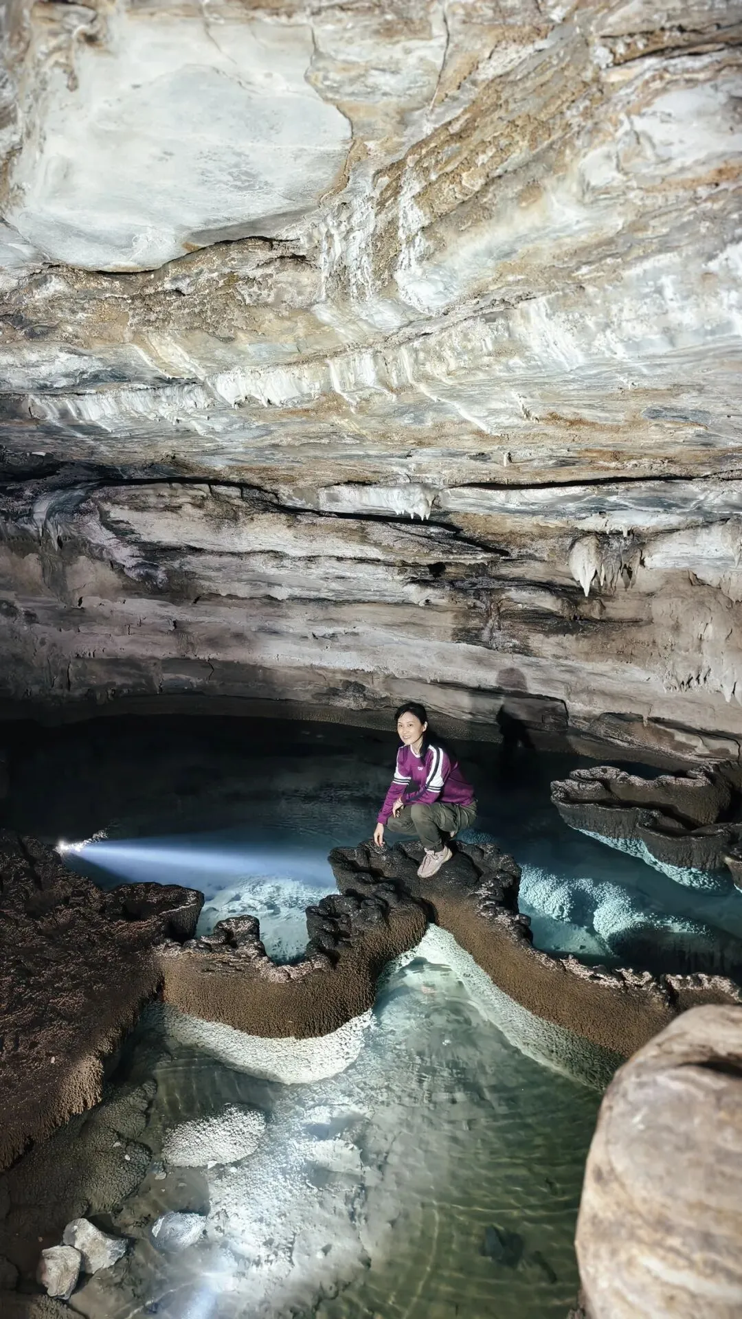 在内敢洞的尽头,有另一个洞口,模特伫立在高耸的岩石之上,摄影师于岩石下仰拍,蓝色星球效果与镜像结合,虚实重叠,将自然与人完美框进照片里。在洞中央山坡右侧,有一大片钙化池,清澈的水面像天然镜子,倒映着钟乳石与灯光,泛着温润的绿光。层层叠叠的钙化池像梯田,波光粼粼间尽显溶洞的柔美。停车场收费10元,有干净的卫生间和水源,适合露营,我们傍晚5点半进洞,八点出来,村民守在洞口,反复确认洞内没人才离开,他说每天都要确认,生怕游客遇到危险。