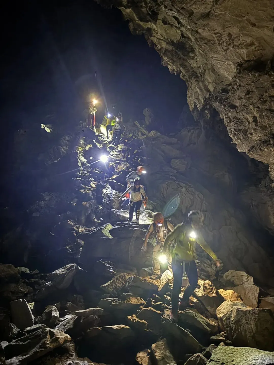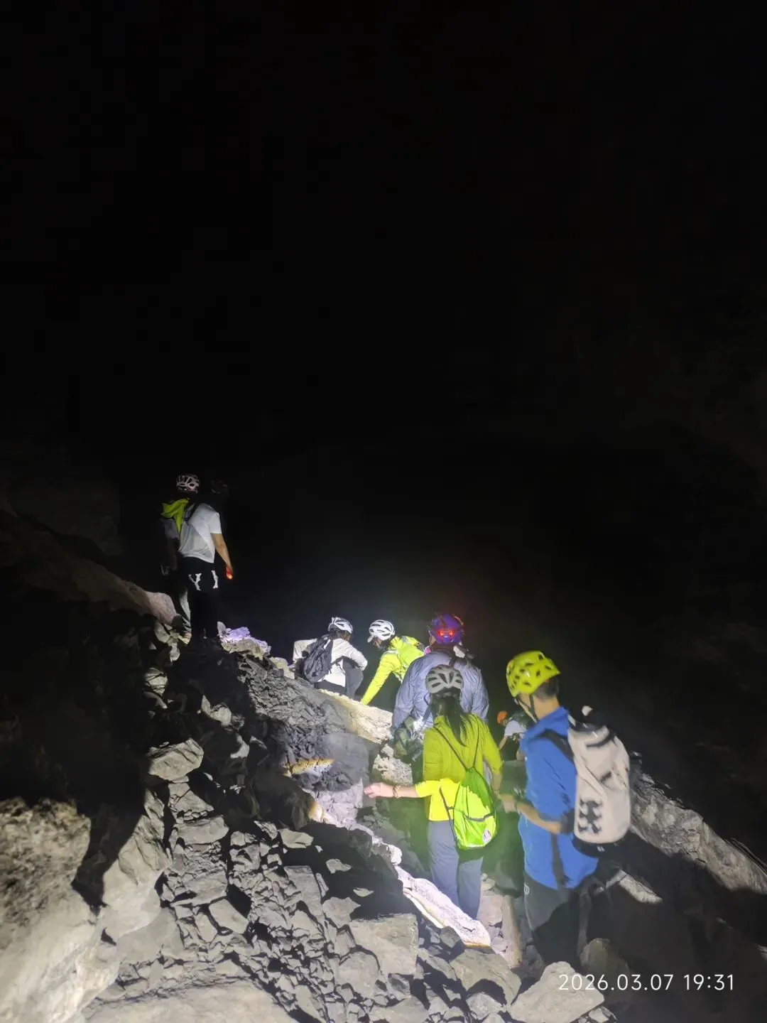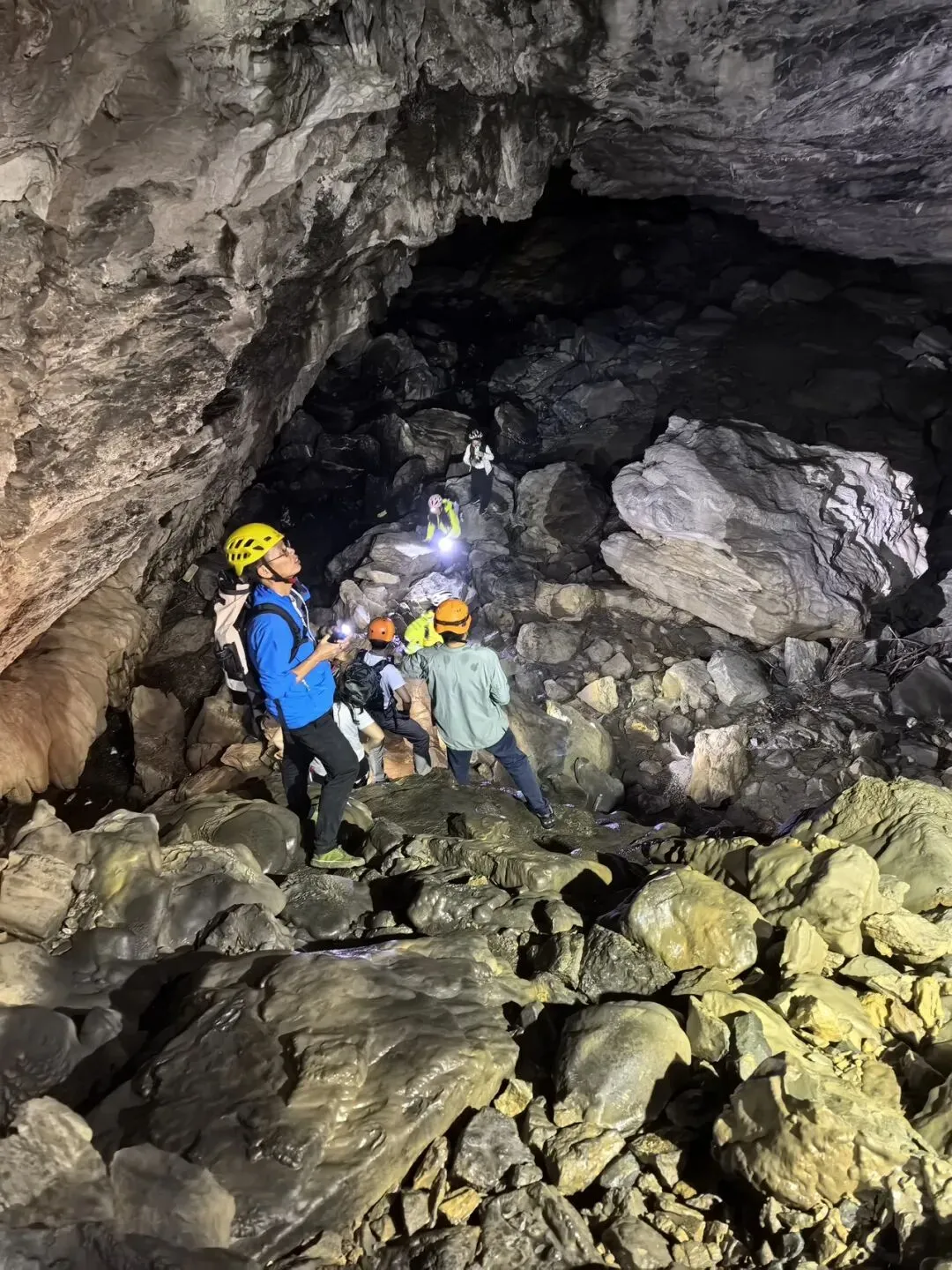 洞里的路如下图所示,碎石横生,棱角尖锐,每一步都在石缝间寻找支点,地势缓缓起伏,既有开阔的洞厅,也有层层叠叠的钙化池,全程约1千米,原路进出,不担心迷路。↓
