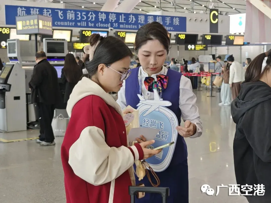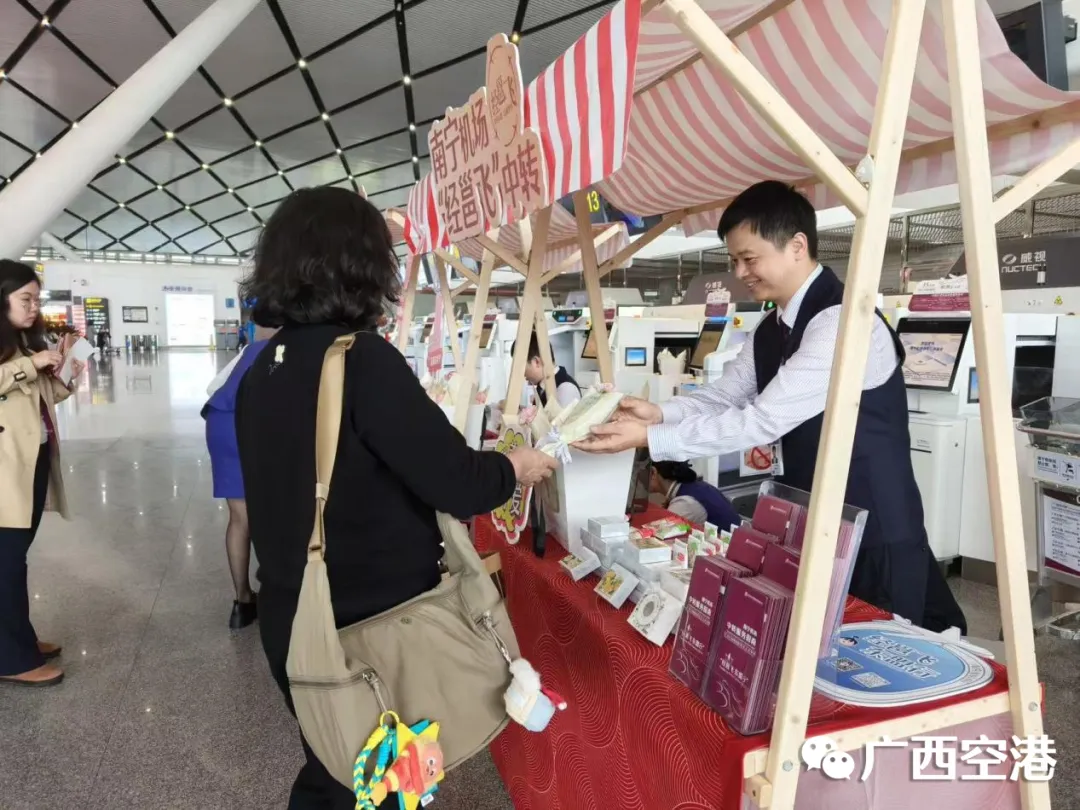 活动期间,工作人员向旅客发放《经邕飞中转服务指南》,详细介绍“一次值机、行李直达”等中转服务举措。