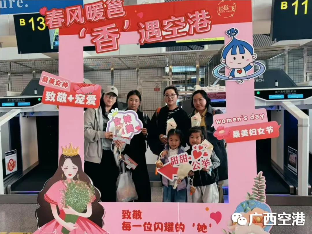 3月8日,南宁机场开展“春风暖邕,‘香’遇空港”国际劳动妇女节主题活动,为女性旅客送上真挚的节日祝福。