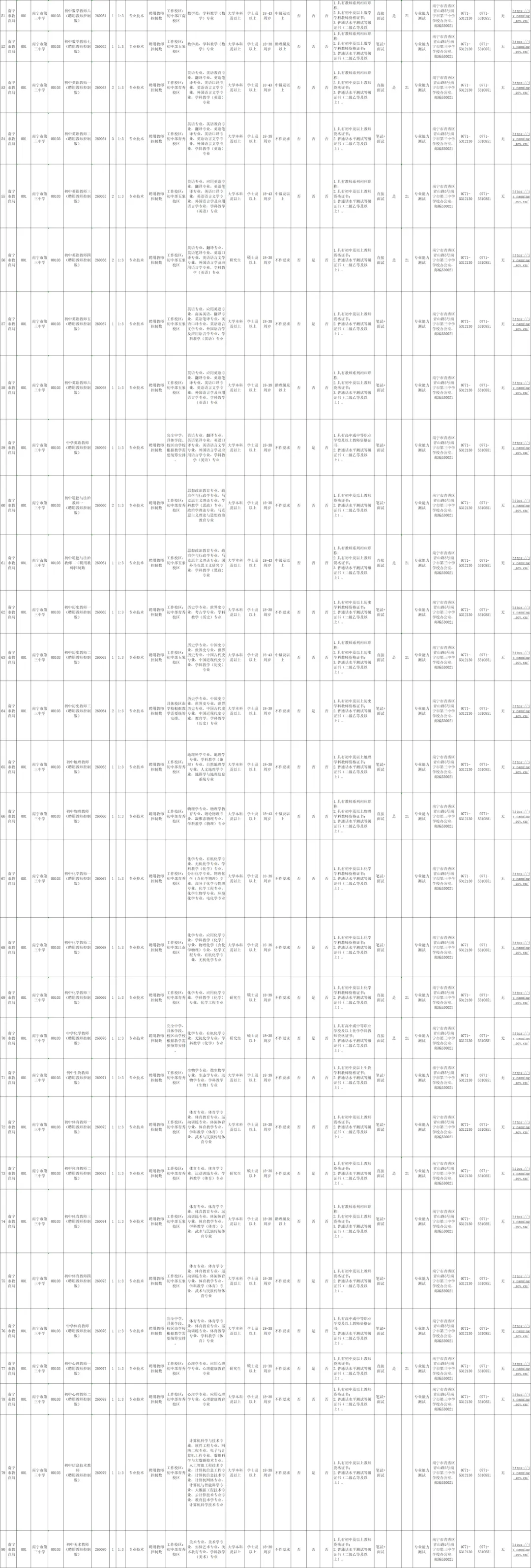 结合南宁市近年来中小学教师招聘工作实际,本次招聘中相应学科教师岗位除了岗位表规定的专业可以报考,该学科对应的教育学类专业〔例如物理教师岗位,对应的学科教学(物理)专业或物理教育专业〕且符合岗位要求的人员也可报考。
