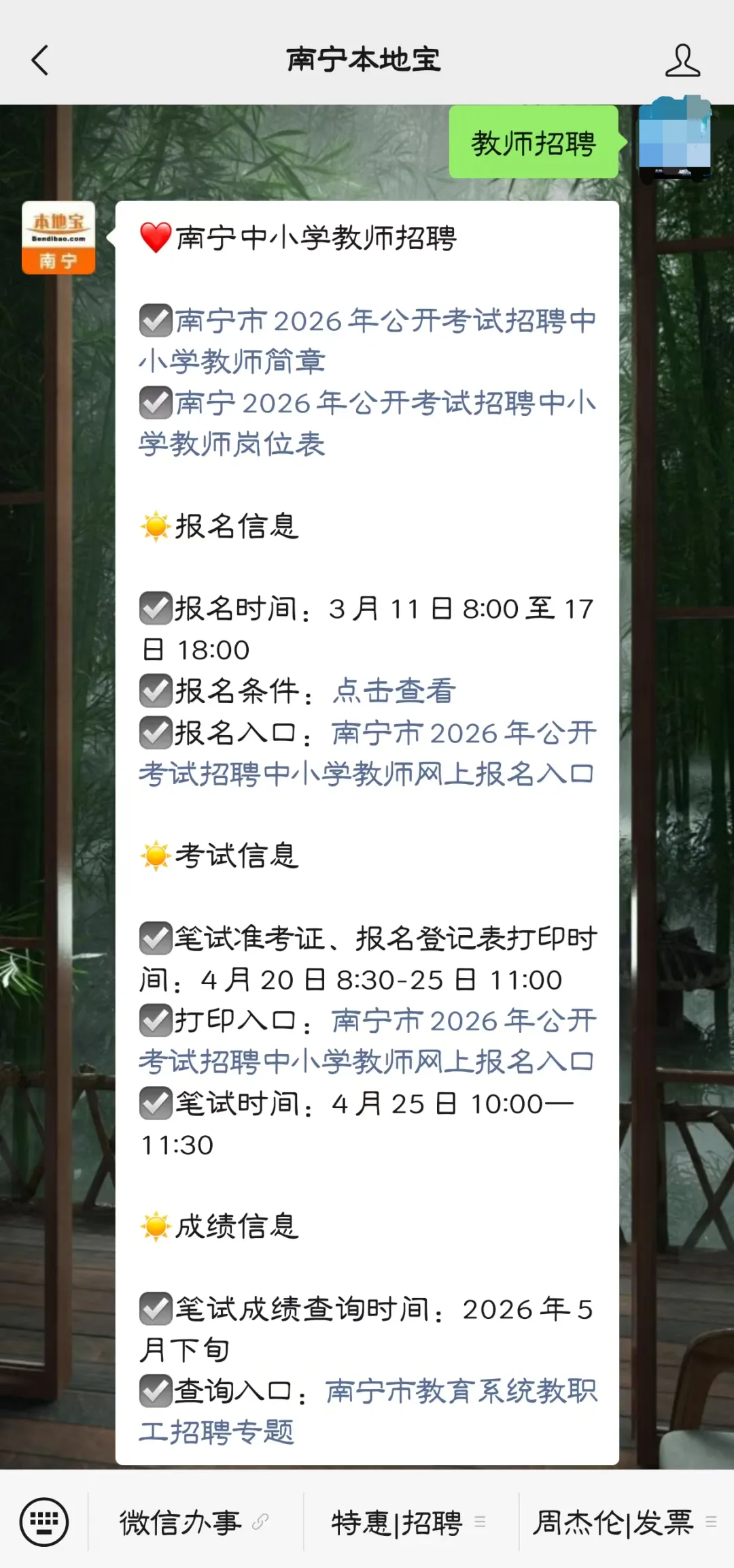 由于篇幅限制,以上为部分信息,详细岗位表可扫描/长按识别下方二维码,关注【南宁本地宝】微信公众号,在首页对话页面发送【教师招聘】,即可快速进入报名入口以及岗位表下载入口、招聘简章全文内容。