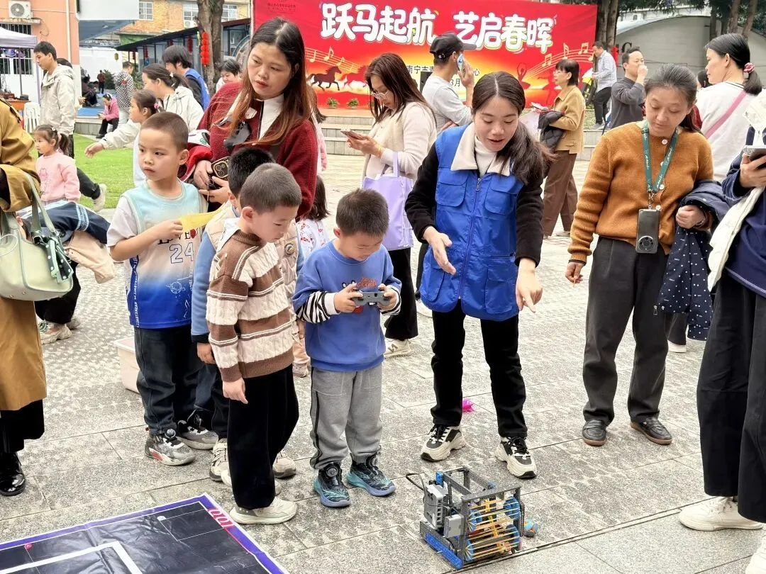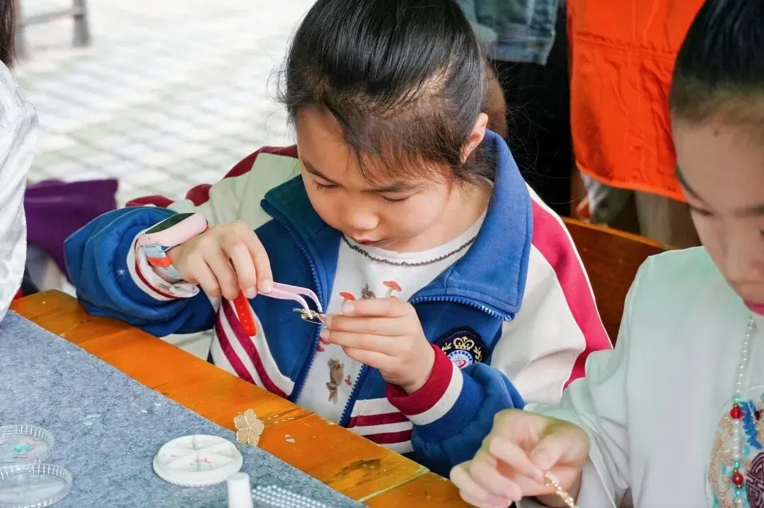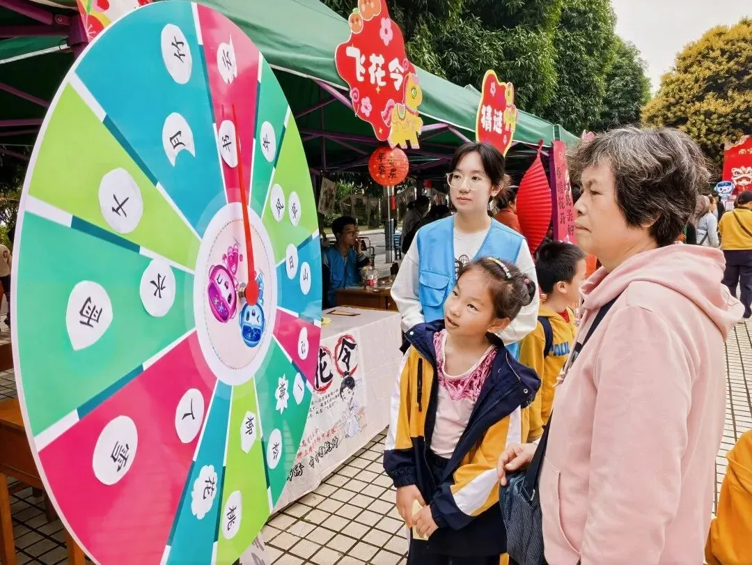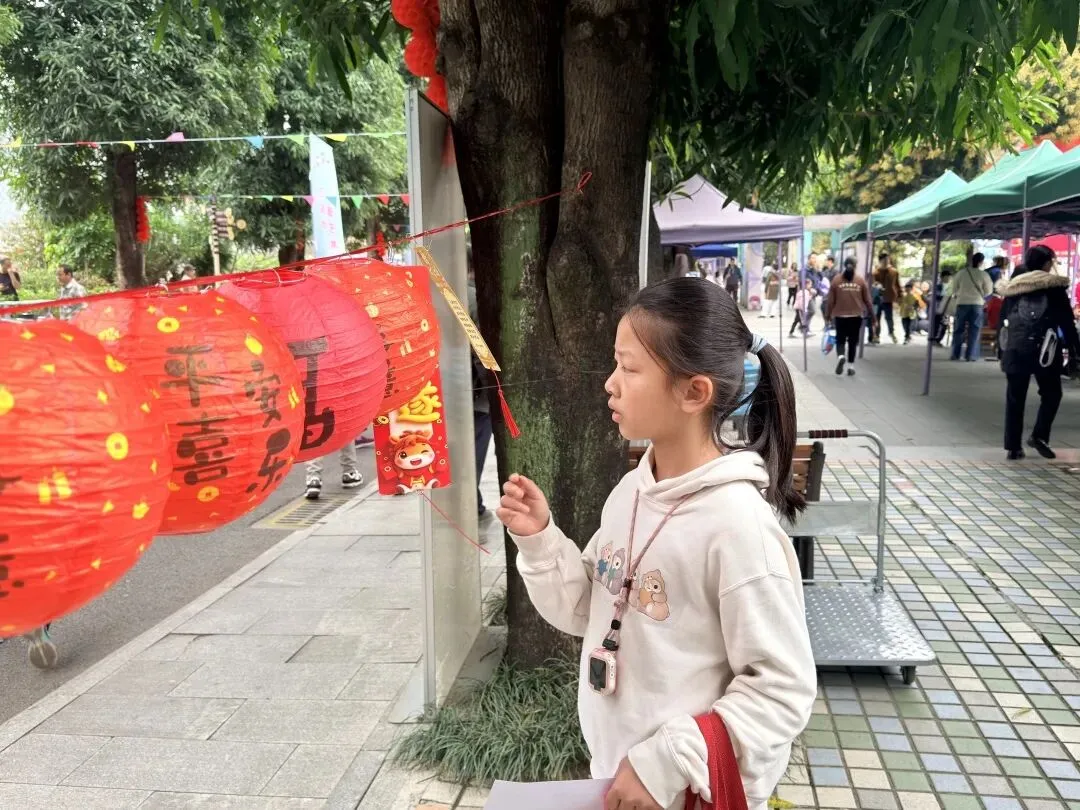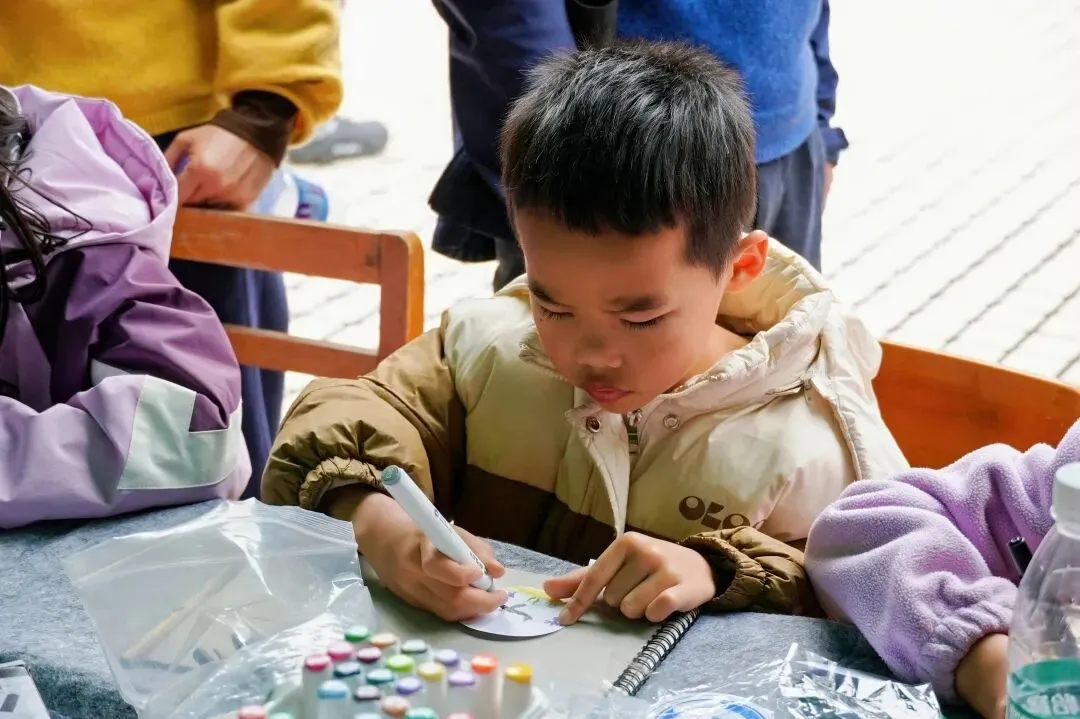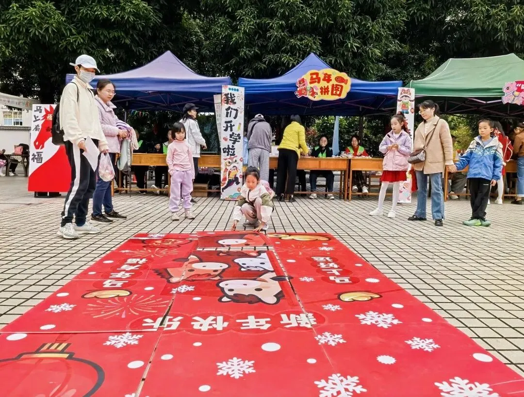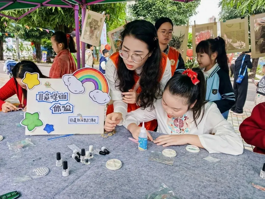 现场还举办了丰富多彩的实践体验活动。“非遗螺钿体验”让孩子们化身小小工匠,用五彩的贝壳薄片拼贴出骏马、花卉等图案,让中华传统工艺在孩子们的指尖下焕发出新的生机;“书画社团徽章印章”手工制作将孩子们的作品转化为独特的徽章,把创意与欢乐带在身上;猜谜与“飞花令”让诗词与智慧在春风中飞扬;唱“马”有礼活动中,清脆童声唱响与马相关的歌曲,歌声与笑声交织成春日的乐章;马年主题拼图区里,孩子们兴致勃勃地合力拼凑奔腾的骏马图案;中心IP集章摊位前,他们盖下专属印章,解锁自己全新的成长印记。
