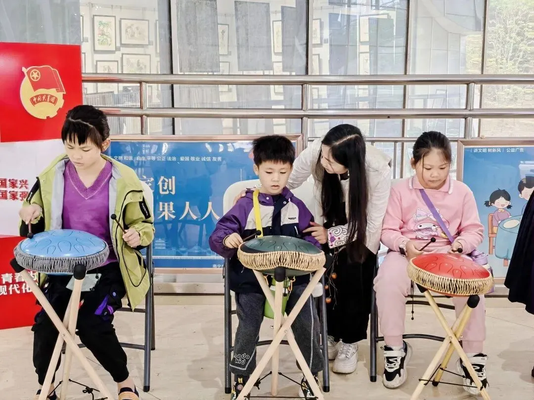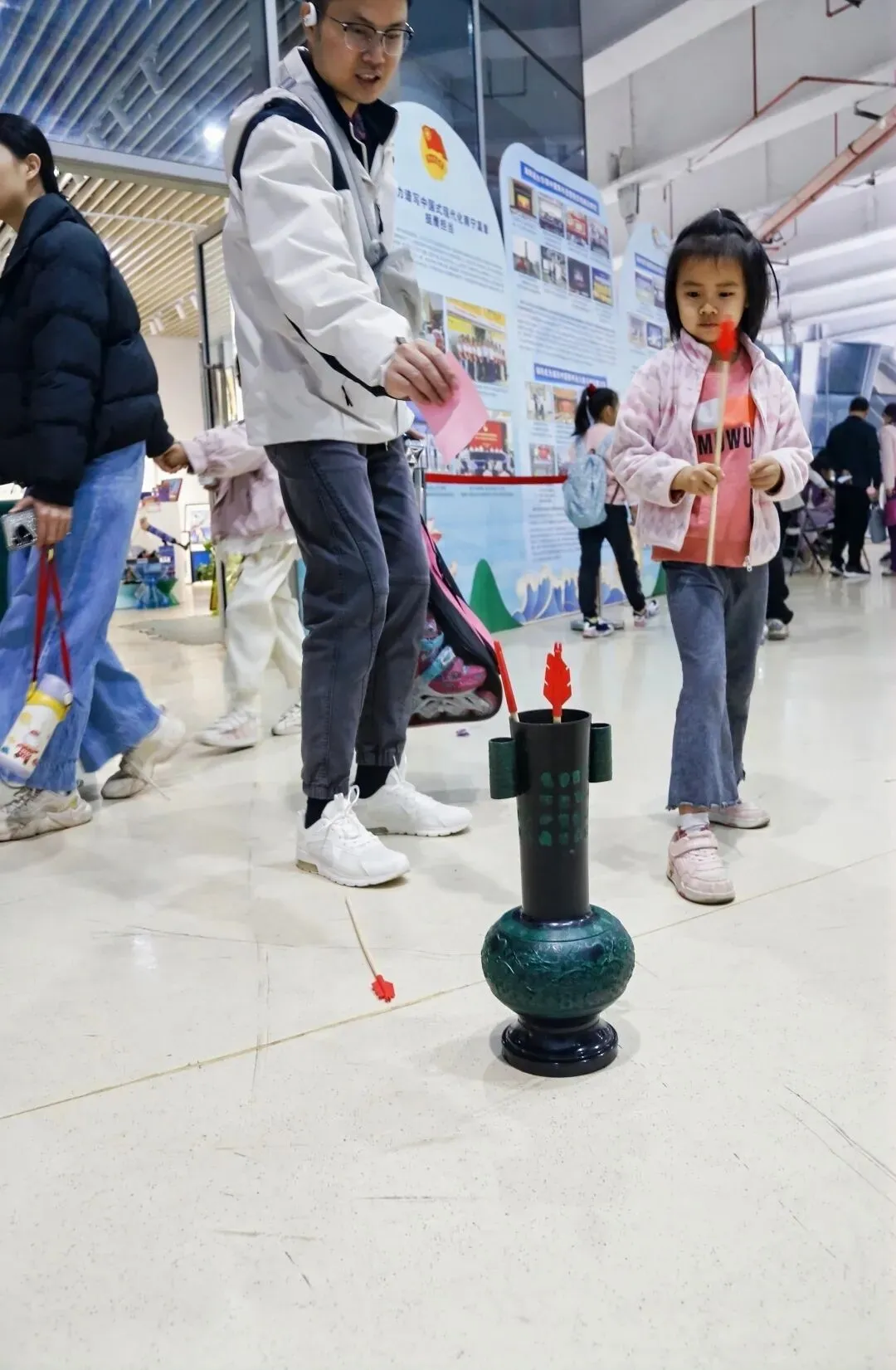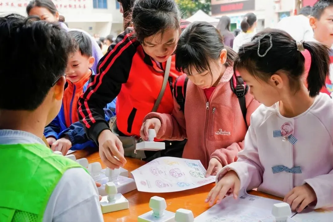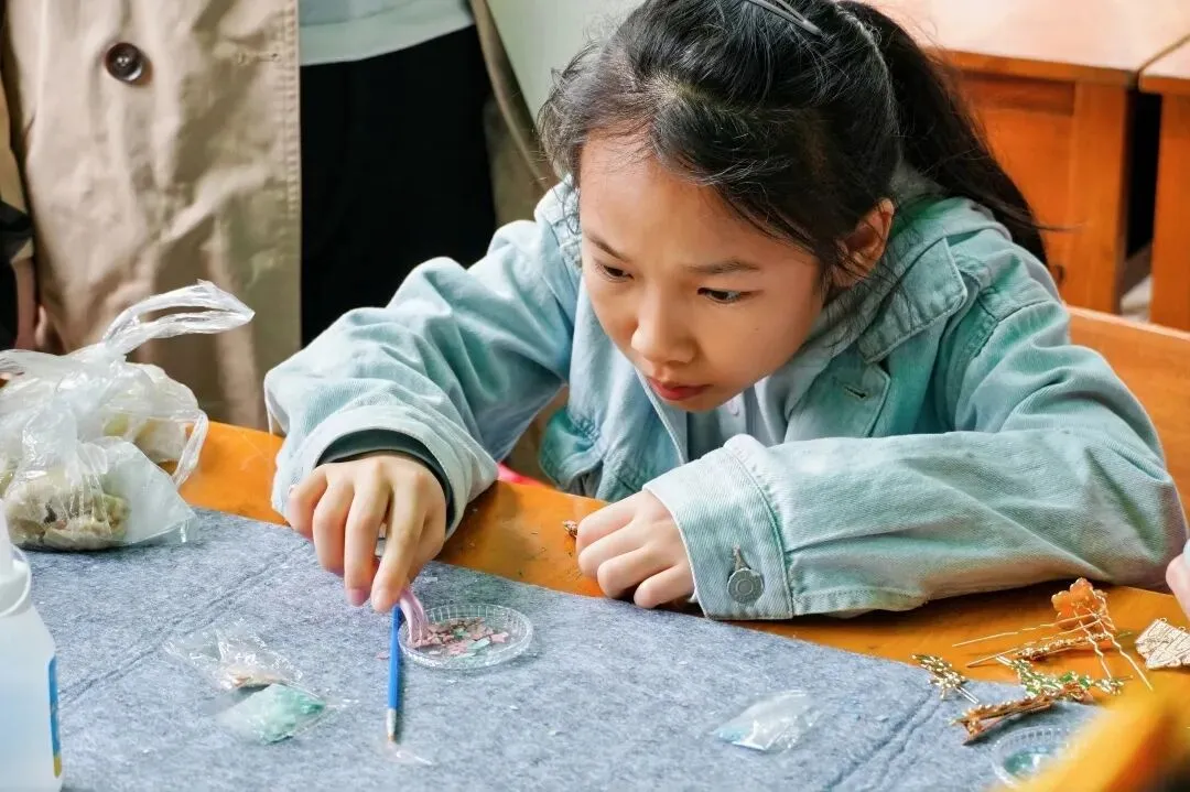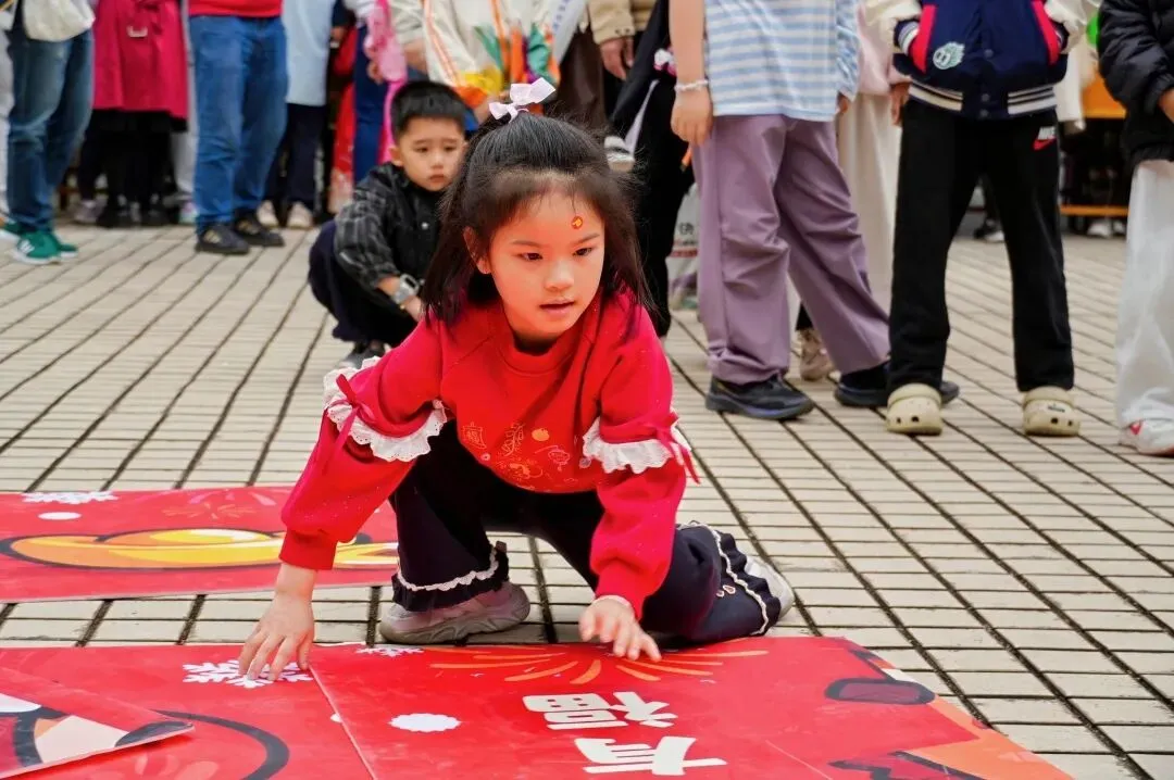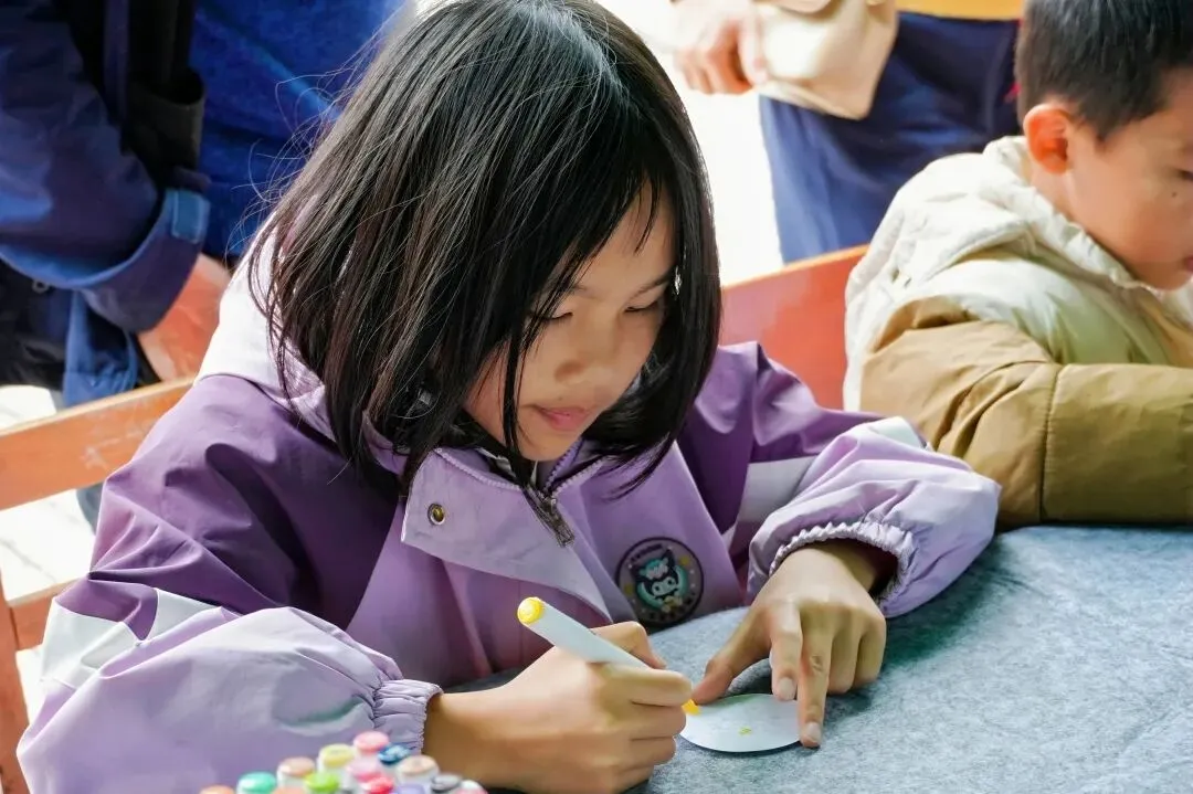 现场还举办了丰富多彩的实践体验活动。“非遗螺钿体验”让孩子们化身小小工匠,用五彩的贝壳薄片拼贴出骏马、花卉等图案,让中华传统工艺在孩子们的指尖下焕发出新的生机;“书画社团徽章印章”手工制作将孩子们的作品转化为独特的徽章,把创意与欢乐带在身上;猜谜与“飞花令”让诗词与智慧在春风中飞扬;唱“马”有礼活动中,清脆童声唱响与马相关的歌曲,歌声与笑声交织成春日的乐章;马年主题拼图区里,孩子们兴致勃勃地合力拼凑奔腾的骏马图案;中心IP集章摊位前,他们盖下专属印章,解锁自己全新的成长印记。
