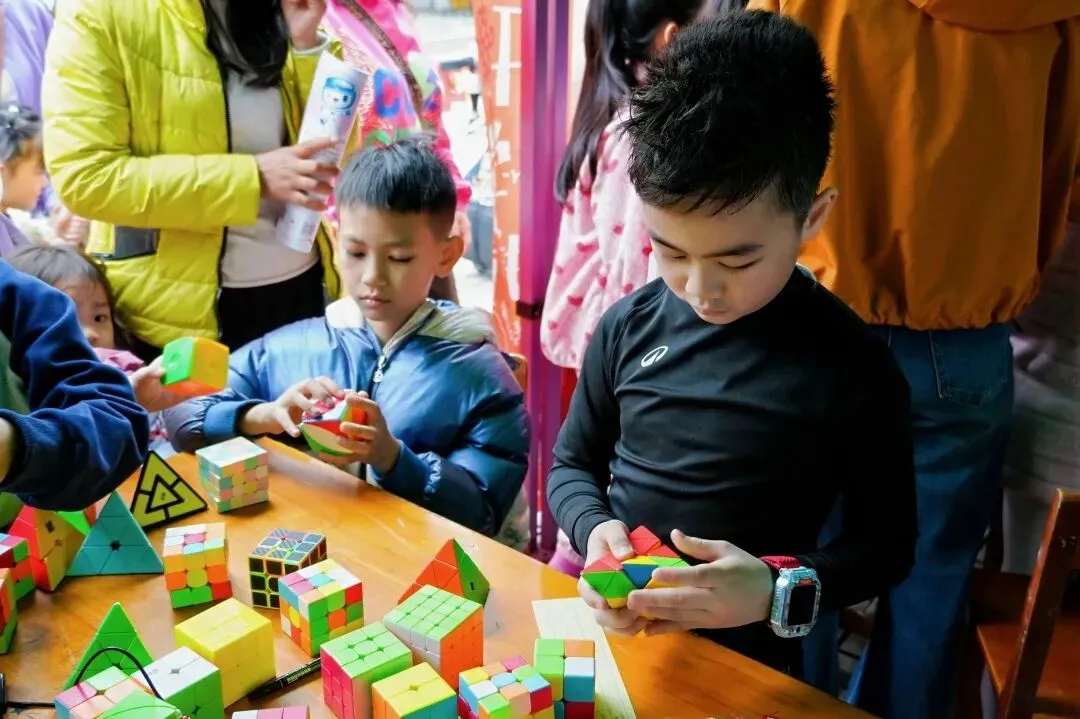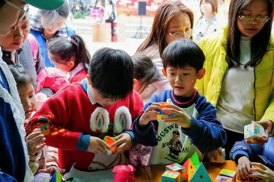 在明秀总部,“机器人闯关赛”被围得水泄不通,孩子们全神贯注地操控着机器人穿越障碍、完成指定任务。每一次成功闯关,都会引发围观小伙伴的热烈掌声。“纸飞机挑战营”中,一架架纸飞机承载着梦想划出优美弧线;“魔方速拧挑战赛”前,小高手们手指翻飞,争分夺秒地还原色块,展现着智慧与速度的较量。