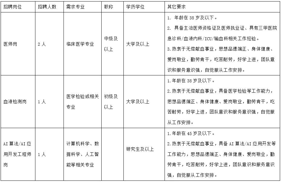遵纪守法,热爱无偿献血事业;成绩优良,品行端正,具有良好的职业道德,无违法违纪等不良记录;身体健康,能胜任所聘岗位工作要求,具有良好的团队协作精神。
