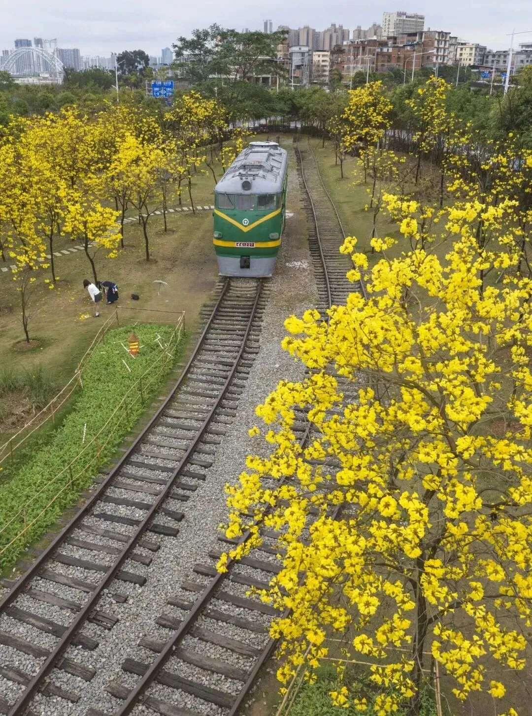 ▲黄花风铃木与绿皮火车,增添了情怀(南宁生活参考)